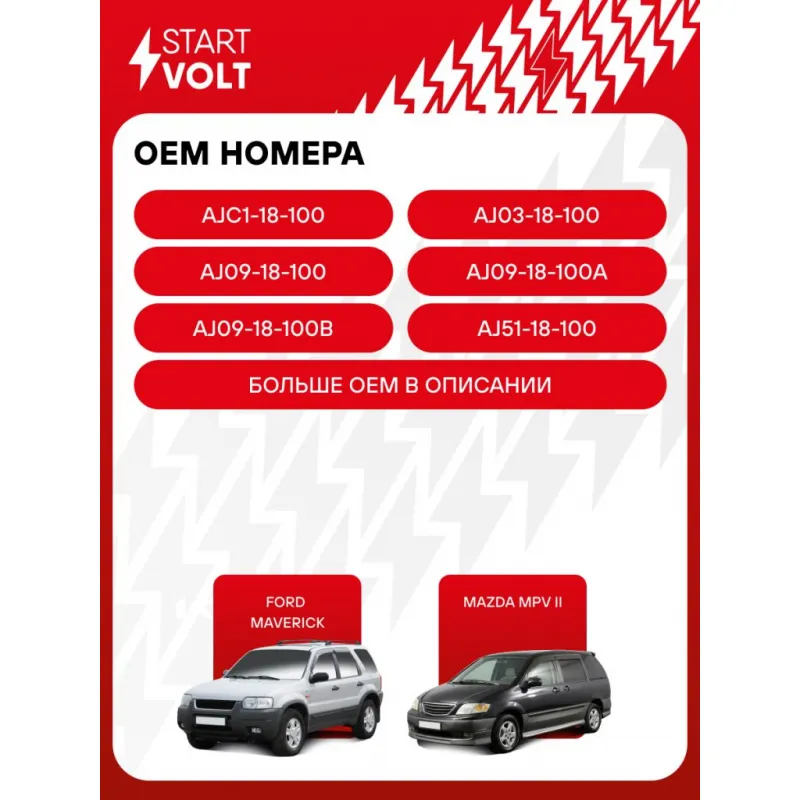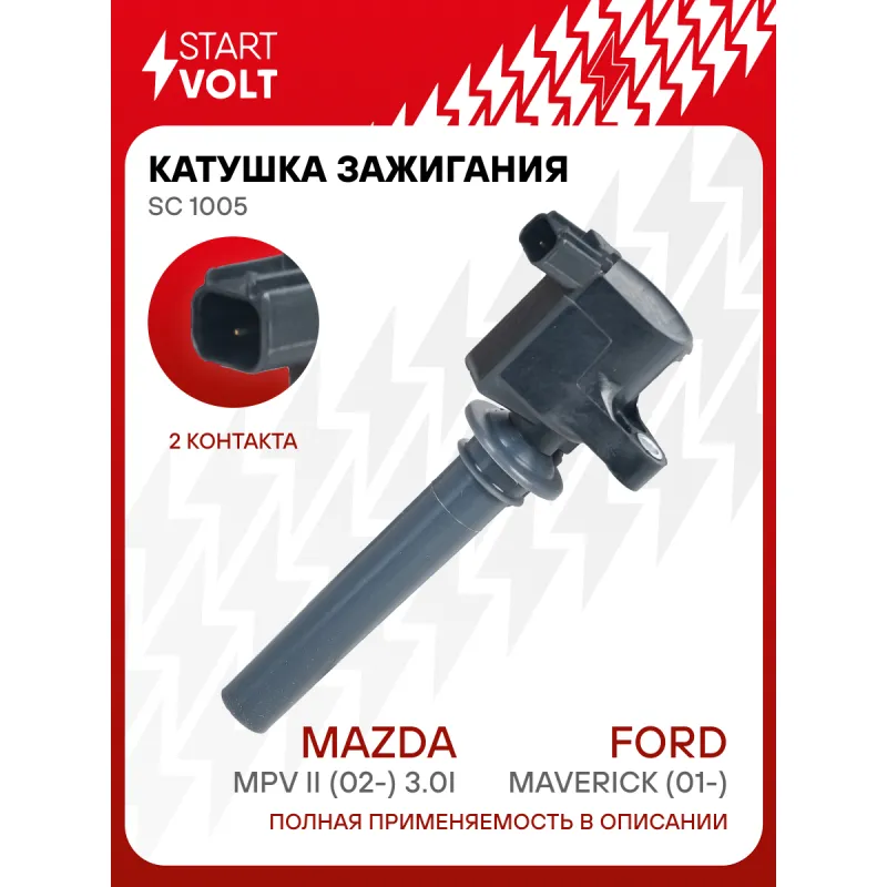 Катушка зажигания для автомобилей Ford Maverick (01-)/Mazda MPV II (02-) 3.0i Характеристики: Артикул: SC 1005 OEM номера: AJC1-18-100, AJ03-18-100, AJ09-18-100, AJ09-18-100A, AJ09-18-100B, AJ51-18-100, AJ51-18-100A, 2M2E-12A366-AC, 2M2Z-12029-AA, 2M2Z12029AC, 4619092, 5 032 660, 5033452, 8M2E12A366AA, 0 221 504 701 Номинальное напряжение, В: 12 Количество контактов: 2 Выходное напряжение, кВ: 30 Наличие коммутатора: Отсутствует Первичное сопротивление, Ом: 0,5 Вторичное сопротивление, кОм: 6 Энергия искры, мДж: 25 Подходящий разъем AIRLINE:: AECC076, AECC261 Подходит для авто: Ford Maverick II (00-) Mazda Tribute (00-) Для проверки применяемости отправьте VIN автомобиля через вкладку "Есть вопросы о товаре?" Комплектация: Паспорт изделия/гарантийный талон - 1 шт Катушка зажигания - 1 шт Гарантия: от 1 года.