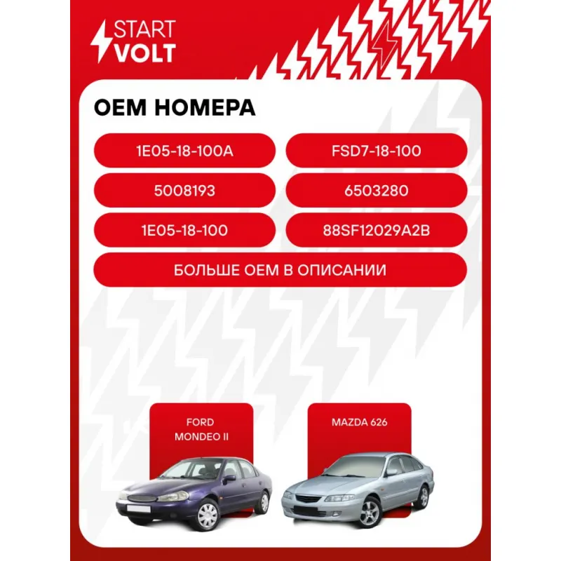 Катушка зажигания для автомобилей Ford Mondeo II (94-)/Mazda 626 (97-) 1.6i-2.0i Характеристики: Артикул: SC 1076 OEM номера: 1E05-18-100A, FSD7-18-100, 5 008 193, 6 503 280, 1E05-18-100, 88SF12029A2B, ZZM0-18-100, 6 497 191, 6 503 279, 1008886, 1008887, 1018139, 1018140, 1078349, 12029CA, 1649067, 6181956, 6503277, 6503278, 6503377, 6860288, 6860289, 88F1 2029A 1A, 88SF-12029A-1A, 88SF-12029A-2A, 88SF 12029 AA, 89BF-12024A-1B, 8SF1 2029A 1A, 928F 12029 CA, 938F 12024 DA, 96FB 12257 AB, E8TF 12029 AA, E8TZ-12029-A, E9TF 12029 AA, F1VU-12029A-1A, F1VU-12029A-2A, F1VY-12029-A, F37U 12029 AA, F37Z-12029-A, F5LU 12029 AA, F5LY-12029-A, F5OU 12029 AA, F5OY-12029-A, F5OY-12029-B, F5RZ-12029-C, 1388-00, 1388-03, 2508-803, F 000 ZS0 212 Количество контактов: 3 Выходное напряжение, кВ: 22 Номинальное напряжение, В: 12 Наличие коммутатора: Отсутствует Первичное сопротивление, Ом: 0,61 Вторичное сопротивление, кОм: 14,85 Первичная индуктивность, мН: 5,8 Вторичная индуктивность, Н: 49 Энергия искры, мДж: 72 Подходит для авто: Ford Fiesta IV (95-), Mondeo I (93-), Mondeo II (96-) Для проверки применяемости отправьте VIN автомобиля через вкладку "Есть вопросы о товаре?" Комплектация: Паспорт изделия/гарантийный талон - 1 шт Катушка зажигания - 1 шт Гарантия: от 1 года.