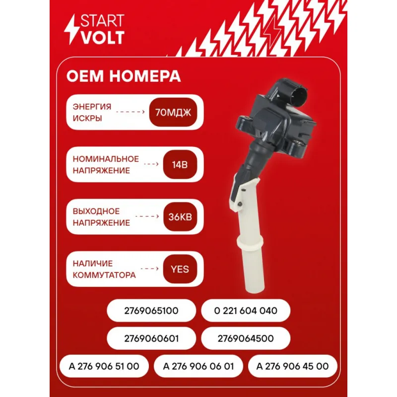 Катушка зажигания для автомобилей Mercedes-Benz M W166 (11-)/E W212 (11-) 3.5T Характеристики: Артикул: SC 1528 OEM номера: A 276 906 51 00, A 276 906 06 01, A 276 906 45 00, 2769060601, 2769064500, 2769065100, 0 221 604 040 Номинальное напряжение, В: 14 Количество контактов: 4 Выходное напряжение, кВ: 36 Наличие коммутатора: + Первичное сопротивление, Ом: - Вторичное сопротивление, кОм: - Первичная индуктивность, мН: - Вторичная индуктивность, Н: - Энергия искры, мДж: 70 Комплектация: Катушка зажигания - 1 шт Паспорт изделия/гарантийный талон - 1 шт Гарантия: от 1 года.