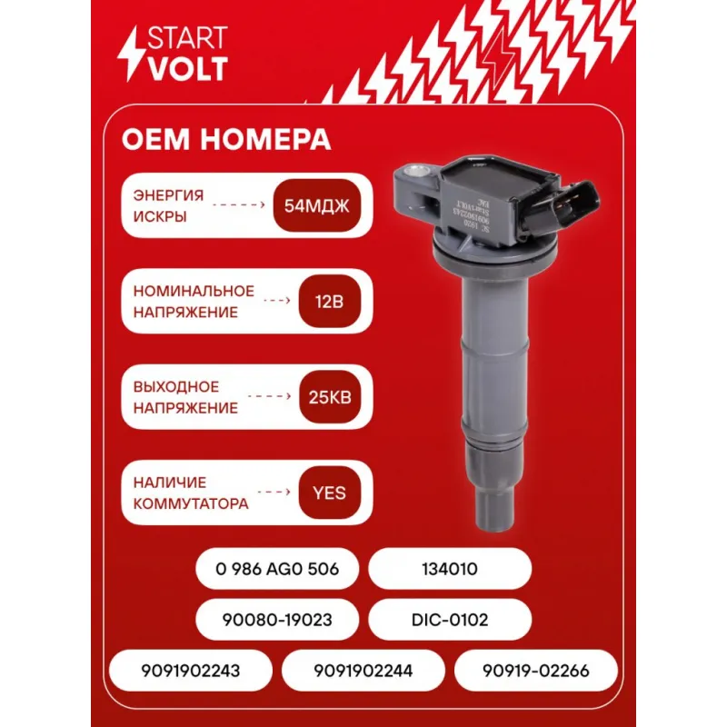 Катушка зажигания для автомобилей Toyota RAV4 (00-) 2.0i/Camry V40 2.4i Характеристики: Артикул: SC 1920 OEM номера: 9091902243, 9091902244, 90919-02266, 90080-19023, DIC-0102, 0 986 AG0 506, 134010 Количество контактов: 4 Подходящий разъем AIRLINE:: AECC344, AECC079 Выходное напряжение, кВ: 25 Номинальное напряжение, В: 12 Наличие коммутатора: Есть Энергия искры, мДж: 54 Подходит для авто: Toyota Avensis (97-), RAV 4 (00-), Camry (01-) Для проверки применяемости отправьте VIN автомобиля через вкладку "Есть вопросы о товаре?" Комплектация: Катушка зажигания - 1 шт Паспорт изделия/гарантийный талон - 1 шт Гарантия: от 1 года.