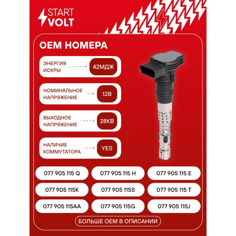Катушка зажигания для автомобилей VAG Touareg (02-)/A8 (02-)4.2i Характеристики: Артикул: SC 1842 OEM номера: 077 905 115AA, 077 905 115G, 077 905 115J, 077 905 115K, 077 905 115S, 077 905 115 T, 077 905 115 Q, 077 905 115 H, 077 905 115 E, 077 905 115 F, 077 905 115 M, 077 905 115 P, 077 905 115 R, 0 986 221 054, 1338-45, 2503-845 Количество контактов: 4 Выходное напряжение, кВ: 28 Номинальное напряжение, В: 12 Наличие коммутатора: Есть Энергия искры, мДж: 42 Подходит для авто: Volkswagen Touareg (02-), Phaeton (02-) Для проверки применяемости отправьте VIN автомобиля через вкладку "Есть вопросы о товаре?" Комплектация: Паспорт изделия/гарантийный талон - 1 шт Катушка зажигания - 1 шт Гарантия: от 1 года.