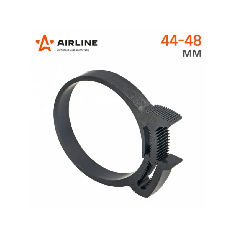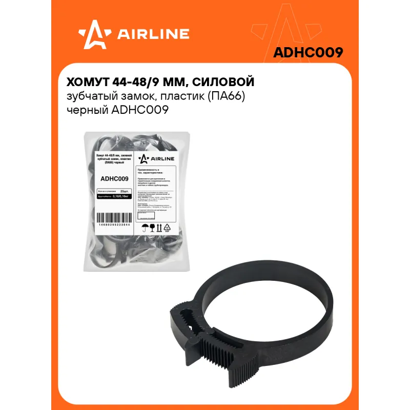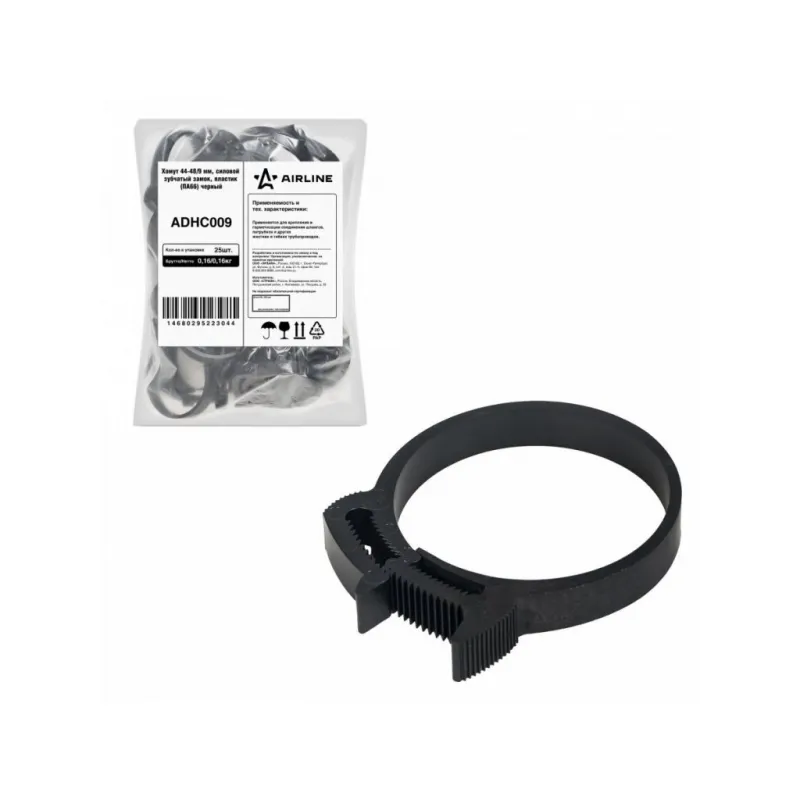 Хомут 44-48/9 мм, силовой зубчатый замок, пластик (ПА66) черный Описание: Хомуты стяжки пластиковые 44-48/7 мм 25 шт AIRLINE ADHC009 с силовым зубчатым замком, предназначен для соединения элементов круглой формы выполнен в разных размерах из материала нейлон(полиамид) 66. - Быстрая и простая установка хомута на элементы круглой формы: шланги, трубы, патрубки, штуцера, проводов. - Устойчив к УФ; - Ударопрочный; - Количество затяжек, < 50 ; - Макс темп. применения - +145 С; - Температура монтажа - -40/+40 °С; Конструктив запорного устройства «Клип-Трек» обеспечивает прочность и надежность, обусловленную его уникальным двойным рядом зубьев в блокирующем замке. Двойной ряд зубьев позволяет создать наибольшую зажимную силу, по сравнению с подобными изделиями с однорядным устройством замка. Дополнительные выступы-упоры, расположенные на верхних поверхностях частей запорного механизма, помогают разъединять хомут без использования специального дополнительного инструмента, делают хомут универсальным и многоразовым для использования. *При максимальном смыкании замка хомута, для его разъединения, возможно, понадобиться инструмент в виде отвертки, чтоб сместить центральный зубчатый шток по отношению к зубчатому пазу в сторону. Набор хомутов для стяжек входят в базовый комплект необходимых автомобильных инструментов. Хомуты - это универсальный и простой в использовании инструмент в быту, для организации кабелей, для сортировки ключей, для фиксации частей мебели, для подвязки растений и фиксации ветвей. Оригинальный товар от производителя Airline. Характеристики: Артикул: ADHC009 Маслобензостойкость: Да Тип замка: зуб зацепной Устойчивость к УФ: Да Ударопрочность: Да Диапозон применения, мм: 44-48 Колиство затяжек,