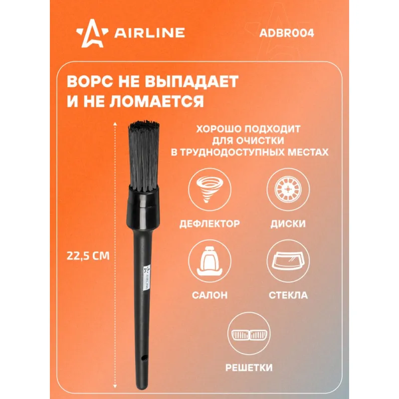 Кисть для детейлинга N12 (22.5см) Описание: Кисти обладают средней жесткостью и состоят из смеси искусственного ворса, что позволяет им эффективно убирать пыль и грязь. Кисть предназначена для тщательной очистки мест в автомобиле, узкие щели и труднодоступные углы, которые обычным способом не удается достичь. Ручка кистей изготовлена из полипропилена, что обеспечивает длительный срок службы в агрессивных средах. Можно приобрести набором и по отдельности. Преимущества: - Устойчива к автохимии; - Универсальный инструмент для уборки автомобиля; - Уборка без разводов и царапин; - Применяется для очищения и нанесения составов. Полезный подарок папе, отцу, мужу, парню и другу для идеальной уборки автомобиля, автохимчистки, колесных дисков и интерьера. Характеристики: Артикул: ADBR004 Диаметр, см: 2,3 Длина, см: 22,5 Ворс: искусственный Цвет: черный Комплектация: Кисть с картонным воблером - 1 шт Гарантия: от 1 года.