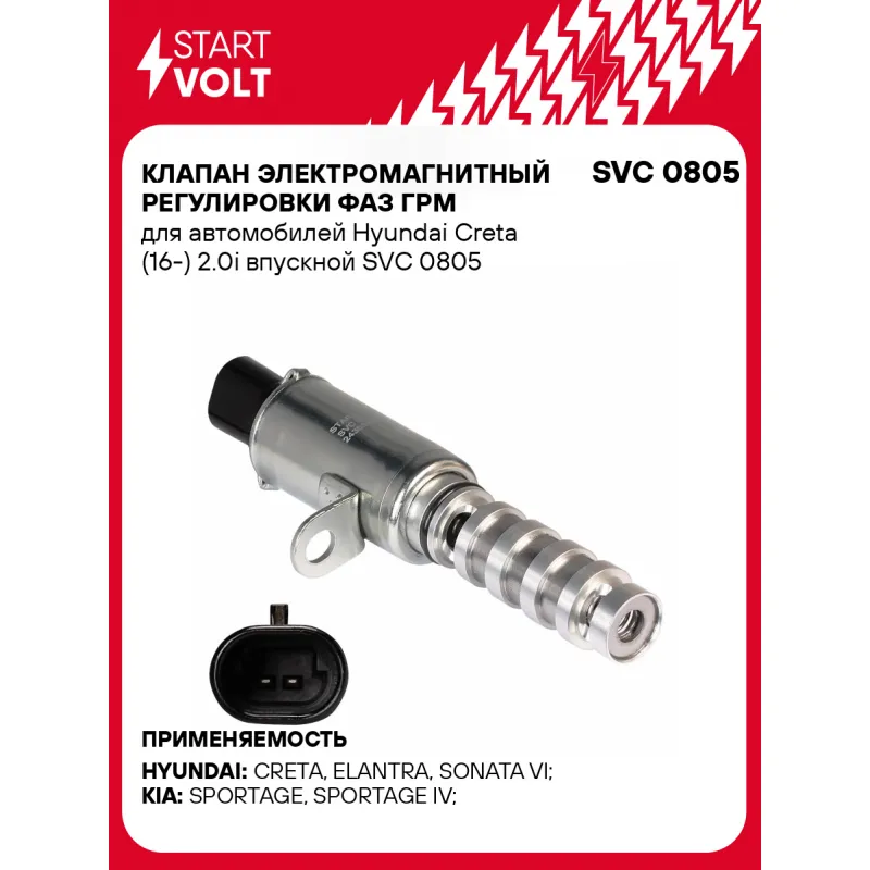 Клапан электромагнитный регулировки фаз ГРМ для автомобилей Hyundai Creta (16-) 2.0i впускной Характеристики: Артикул: SVC 0805 OEM номера: 24355-2E100 Количество на автомобиль: 1 Номинальное напряжение, В: 12 Сопротивление изоляции обмотки клапана, Ом: 7 Комплектация: Паспорт изделия/гарантийный талон Клапан электромагнитный регулировки фаз ГРМ - 1 шт Гарантия: от 1 года.
