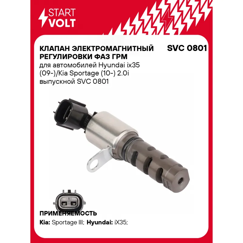 Клапан электромагнитный регулировки фаз ГРМ для автомобилей Hyundai ix35 (09-)/Kia Sportage (10-) 2.0i выпускной Характеристики: Артикул: SVC 0801 OEM номера: 24375-2G200, 24375-2G100 Сопротивление изоляции обмотки клапана, Ом: 7,6 Количество на автомобиль: 1 Номинальное напряжение, В: 12 Подходит для авто: Kia Sportage III (10-) Hyundai iX35 (10-) Для проверки применяемости отправьте VIN автомобиля через вкладку "Есть вопросы о товаре?" Комплектация: Клапан электромагнитный регулировки фаз ГРМ Паспорт изделия/гарантийный талон Гарантия: от 1 года.