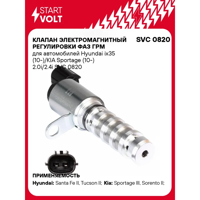 Клапан электромагнитный регулировки фаз ГРМ для автомобилей Hyundai ix35 (10-)/KIA Sportage (10-) 2.0i/2.4i Характеристики: Артикул: SVC 0820 OEM номера: 24355-2G500 Номинальное напряжение, В: 12 Сопротивление изоляции обмотки клапана, Ом: 7,6 Количество на автомобиль: 1 Подходит для авто: Hyundai Santa Fe II (06-), Tucson II (11-), Sonata VI (YF) (10-), Starex (H-1) (07-), iX35 (10-), Santa Fe III (12-) Kia Sportage III (10-), Sorento II (09-), Cerato II (09-), Carens II (06-), Optima (11-) Для проверки применяемости отправьте VIN автомобиля через вкладку "Есть вопросы о товаре?" Комплектация: Паспорт изделия/гарантийный талон Клапан электромагнитный регулировки фаз ГРМ - 1 шт Гарантия: от 1 года.