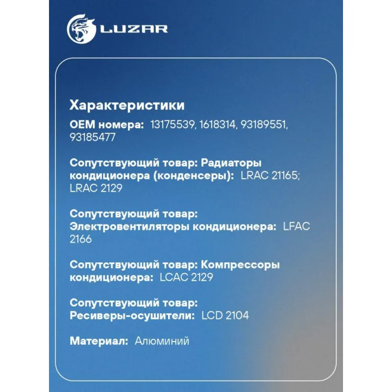 | Сопутствующий товар: Радиаторы кондиционера (конденсеры) | LRAC 21165; LRAC 2129 |