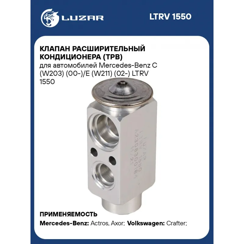 Клапан расширительный кондиционера (ТРВ) для автомобилей Mercedes-Benz C (W203) (00-)/E (W211) (02-) Характеристики: Артикул: LTRV 1550 OEM номера: A2308300184 , A4638306601, A0028308284, A2218300584, 2308300184, 4638306601, 2218300584, 0028308284, 2E0819810 Количество на автомобиль: 1 Материал: алюминий Сопутствующий товар: Ресиверы-осушители: LCD 1808; LCR 1501; LCR 1502; LCR 1506 Сопутствующий товар: Радиаторы кондиционера (конденсеры): LRAC 1502; LRAC 1503; LRAC 1512; LRAC 15164; LRAC 1550; LRAC 1570 Сопутствующий товар: Компрессоры кондиционера: LCAC 15164; LCAC 1540; LCAC 1550; LCAC 1552 Подходит для авто: Mercedes-Benz Actros (96-), Actros (96-), Actros (03-), Axor (04-), C-Class W203 (00-), C-Class W204 (07-), C-Class W204 (07-), CL C216 (06-), CLS C219 (04-), CLS C219 (04-), CLS C219 (04-), E-Class W212 (09-), E-Class W211 (02-), E-Class W211 (02-), GLK X204 (08-), G W463 (90-), S-Class W220 (98-), S-Class W220 (98-), S-Class W220 (98-), S-Class W221 (05-), Sprinter (06-), Axor (01-), Axor (01-), Axor (04-), E-Class W212 (09-) Volkswagen Crafter (06-) Для проверки применяемости отправьте VIN автомобиля через вкладку "Есть вопросы о товаре?" Комплектация: Паспорт изделия Клапан расширительный кондиционера (ТРВ) Гарантия: от 1 года.