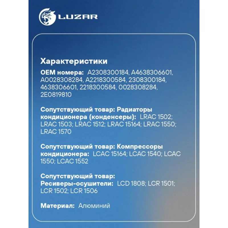 | Сопутствующий товар: Радиаторы кондиционера (конденсеры) | LRAC 1502; LRAC 1503; LRAC 1512; LRAC 15164; LRAC 1550; LRAC 1570 |