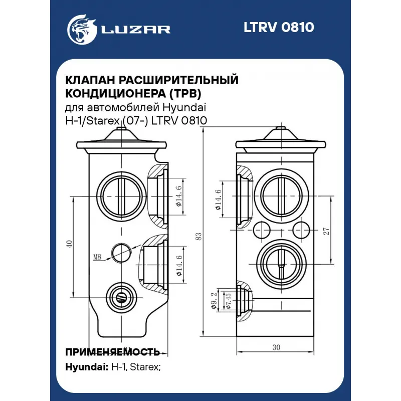 Клапан расширительный кондиционера (ТРВ) для автомобилей Hyundai H-1/Starex (07-) Характеристики: Артикул: LTRV 0810 OEM номера: 97604-4H000 Сопутствующий товар: Радиаторы кондиционера (конденсеры): LRAC 08H4 Сопутствующий товар: Компрессоры кондиционера: LCAC 0840 Количество на автомобиль: 1 Материал: алюминий Подходит для авто: Hyundai H-1 (08-), Starex (H-1) (07-), Starex (H-1) (07-) Для проверки применяемости отправьте VIN автомобиля через вкладку "Есть вопросы о товаре?" Комплектация: Клапан расширительный кондиционера (ТРВ) Паспорт изделия Гарантия: от 1 года.