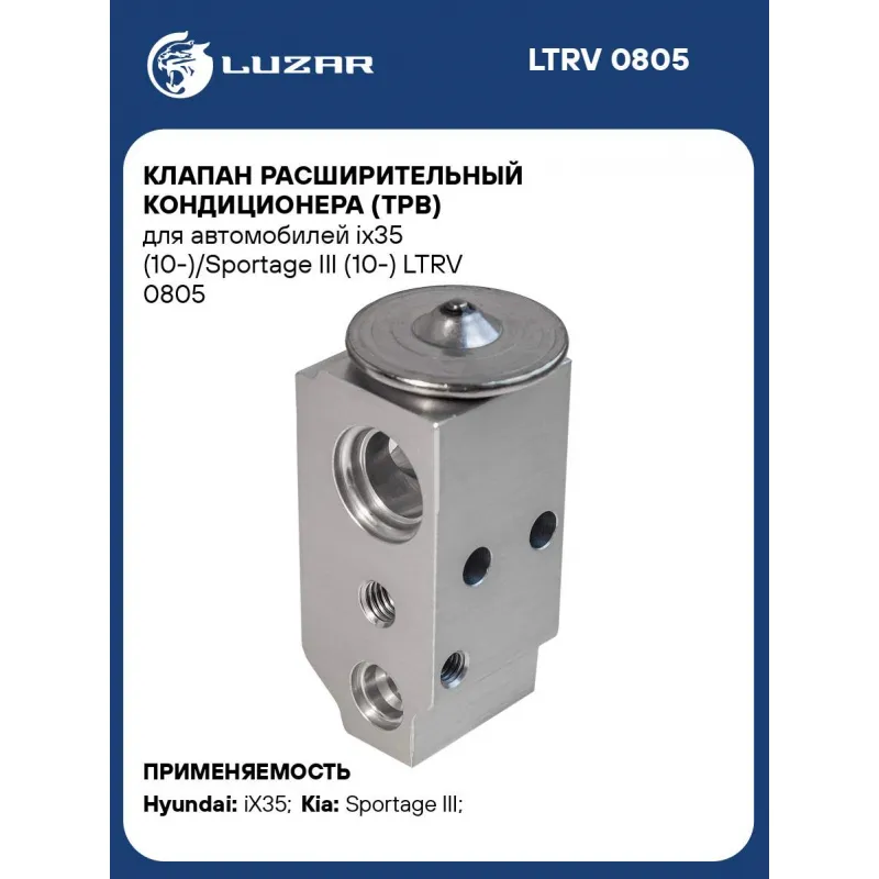 Клапан расширительный кондиционера (ТРВ) для автомобилей ix35 (10-)/Sportage III (10-) Характеристики: Артикул: LTRV 0805 OEM номера: 97626-2Y000 Количество на автомобиль: 1 Материал: алюминий Сопутствующий товар: Ресиверы-осушители: LCD 0801 Сопутствующий товар: Радиаторы кондиционера (конденсеры): LRAC 0825; LRAC 0827; LRAC 08S5; LRAC 08Y5 Сопутствующий товар: Компрессоры кондиционера: LCAC 0805; LCAC 08S5 Подходит для авто: Hyundai iX35 (10-), iX35 (10-) Kia Sportage III (10-) Для проверки применяемости отправьте VIN автомобиля через вкладку "Есть вопросы о товаре?" Комплектация: Клапан расширительный кондиционера (ТРВ) Паспорт изделия Гарантия: от 1 года.