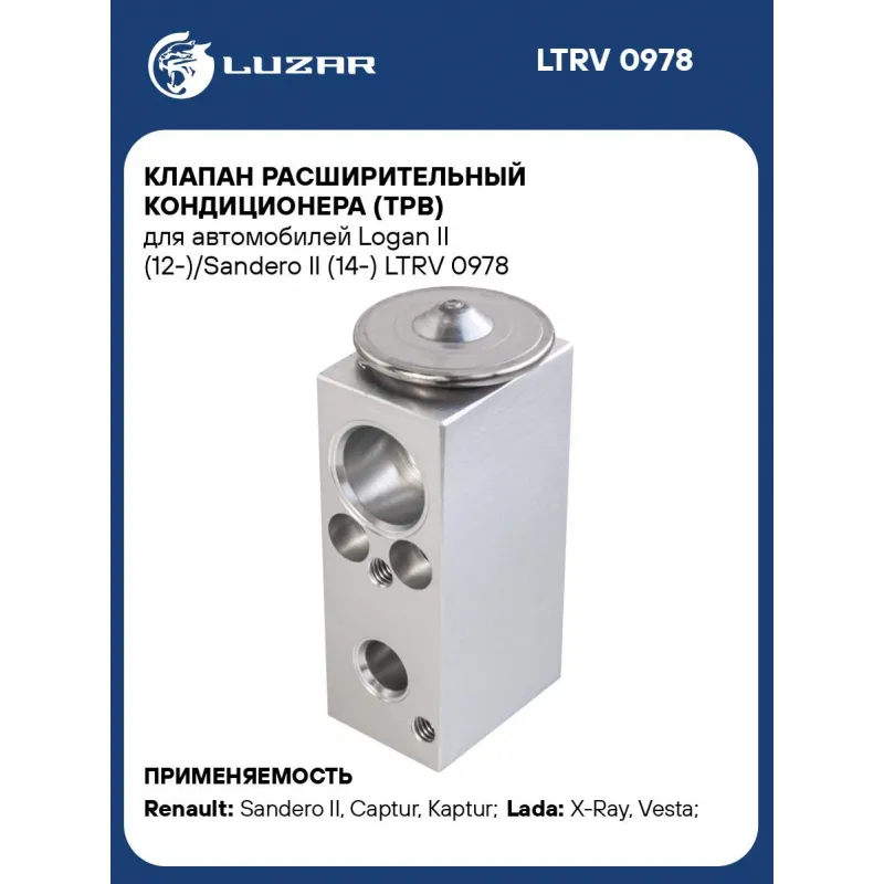 Клапан расширительный кондиционера (ТРВ) для автомобилей Logan II (12-)/Sandero II (14-) Характеристики: Артикул: LTRV 0978 OEM номера: 922700505R, 8450022030 Количество на автомобиль: 1 Материал: алюминий Сопутствующий товар: Радиаторы кондиционера (конденсеры): LRAC 0978 Сопутствующий товар: Компрессоры кондиционера: LCAC 0976; LCAC 0978 Подходит для авто: Renault Sandero II (14-), Captur (13-), Kaptur (16-), Logan II (12-), Sandero II (14-) ВАЗ X-Ray (15-), Vesta (15-), Vesta (15-) Для проверки применяемости отправьте VIN автомобиля через вкладку "Есть вопросы о товаре?" Комплектация: Клапан расширительный (ТРВ) Паспорт изделия Гарантия: от 1 года.