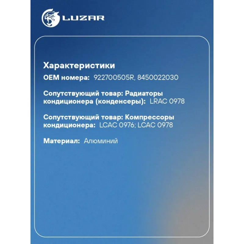 | Сопутствующий товар: Радиаторы кондиционера (конденсеры) | LRAC 0978 |