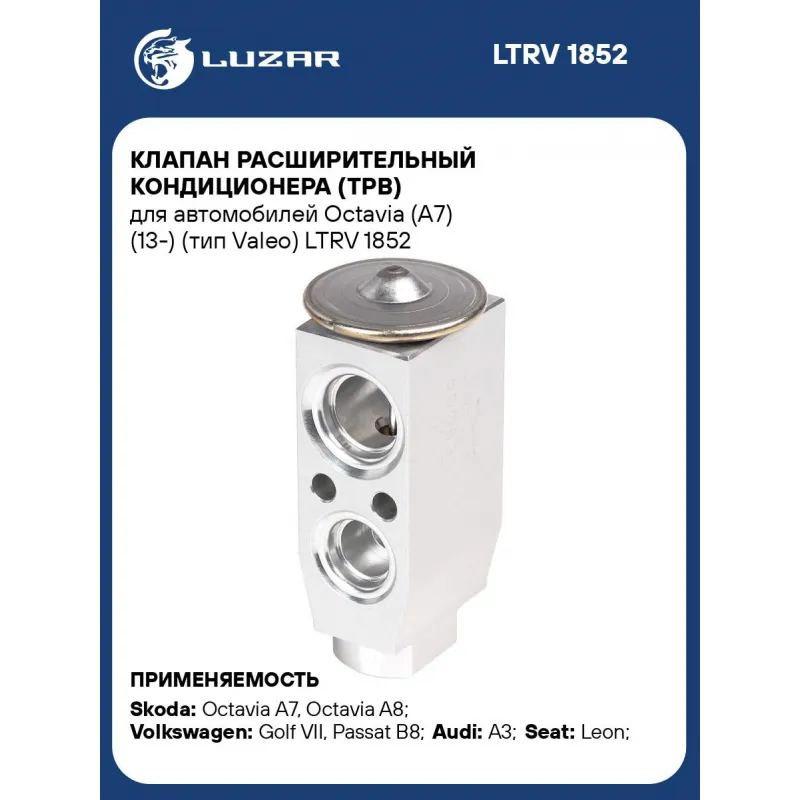 Клапан расширительный кондиционера (ТРВ) для автомобилей Octavia (A7) (13-) (тип Valeo) Характеристики: Артикул: LTRV 1852 OEM номера: 5Q0820679C, 5Q0820679, 5Q0816679B Сопутствующий товар: Элементы для уплотнения соединений: LGS 0034 Количество на автомобиль: 1 Материал: алюминий Сопутствующий товар: Радиаторы кондиционера (конденсеры): LRAC 1851 Сопутствующий товар: Компрессоры кондиционера: LCAC 18K1 Сопутствующий товар: Электровентиляторы кондиционера: LFAC 18K0 Подходит для авто: Skoda Octavia A7 (13-), Octavia A8 (20-), Octavia A7 (13-), Superb III (15-) Volkswagen Golf VII (12-), Passat B8 (15-), Golf VII (12-), Passat B8 (15-), Touran III (15-) Audi A3 (12-) Seat Leon (12-) Для проверки применяемости отправьте VIN автомобиля через вкладку "Есть вопросы о товаре?" Комплектация: Клапан расширительный кондиционера (ТРВ) Паспорт изделия Гарантия: от 1 года.