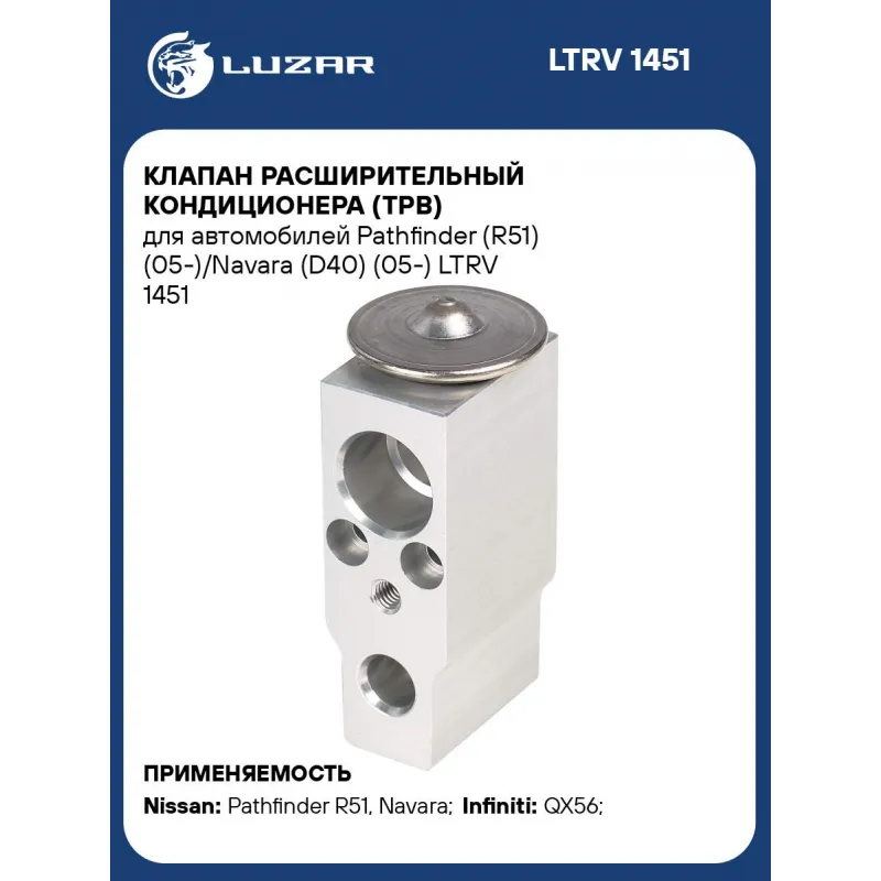 Клапан расширительный кондиционера (ТРВ) для автомобилей Pathfinder (R51) (05-)/Navara (D40) (05-) Характеристики: Артикул: LTRV 1451 OEM номера: 92200-5Z000, 92200-5Z010 Количество на автомобиль: 1 Материал: алюминий Сопутствующий товар: Радиаторы кондиционера (конденсеры): LRAC 14EB Сопутствующий товар: Компрессоры кондиционера: LCAC 1451 Подходит для авто: Nissan Pathfinder R51 (05-), Pathfinder R51 (05-), Navara (05-), Pathfinder R51 (05-) Infiniti QX56 (04-) Для проверки применяемости отправьте VIN автомобиля через вкладку "Есть вопросы о товаре?" Комплектация: Клапан расширительный кондиционера (ТРВ) Паспорт изделия Гарантия: от 1 года.