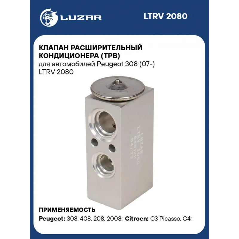 Клапан расширительный кондиционера (ТРВ) для автомобилей Peugeot 308 (07-) Характеристики: Артикул: LTRV 2080 OEM номера: 6461L9, 1608183980 Количество на автомобиль: 1 Материал: алюминий Сопутствующий товар: Радиаторы кондиционера (конденсеры): LRAC 2008; LRAC 20GH; LRAC 20GK Сопутствующий товар: Компрессоры кондиционера: LCAC 2016; LCAC 20Z6 Подходит для авто: Peugeot 308 (07-), 308 (07-), 408 (10-), 208 (12-), 2008 (13-), 308 (07-), 408 (10-), 208 (12-) Citroen C3 Picasso (09-), C4 (10-), C4 (10-) Для проверки применяемости отправьте VIN автомобиля через вкладку "Есть вопросы о товаре?" Комплектация: Клапан расширительный кондиционера (ТРВ) Паспорт изделия Гарантия: от 1 года.