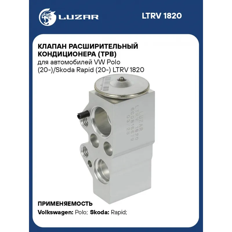 Клапан расширительный кондиционера (ТРВ) для автомобилей VW Polo (20-)/Skoda Rapid (20-) Характеристики: Артикул: LTRV 1820 OEM номера: 6C0816679, 6C0820679 Сопутствующий товар: Радиаторы кондиционера (конденсеры): LRAC 1853 Сопутствующий товар: Компрессоры кондиционера: LCAC 18K1 Количество на автомобиль: 1 Материал: алюминий Подходит для авто: Volkswagen Polo (RUS) (20-) Skoda Rapid (20-) Для проверки применяемости отправьте VIN автомобиля через вкладку "Есть вопросы о товаре?" Комплектация: Клапан расширительный кондиционера (ТРВ) Паспорт изделия Гарантия: от 1 года.