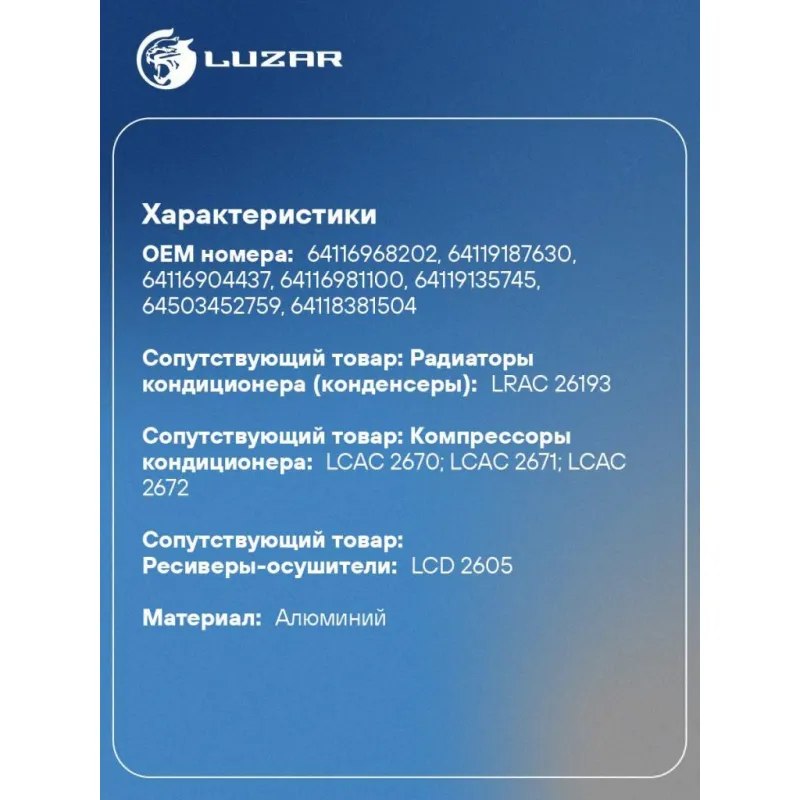 | Сопутствующий товар: Радиаторы кондиционера (конденсеры) | LRAC 26193 |