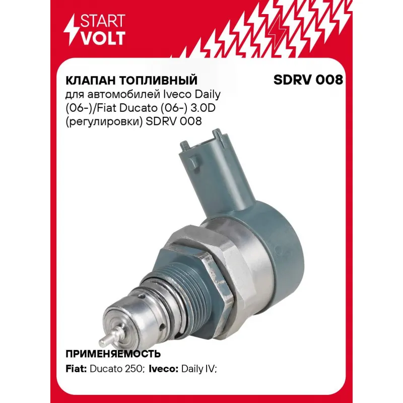 Клапан топливный для автомобилей Iveco Daily (06-)/Fiat Ducato (06-) 3.0D (регулировки) Характеристики: Артикул: SDRV 008 OEM номера: 504384251, 0 281 006 032 Номинальное напряжение, В: 12 Количество на автомобиль: 1 Подходит для авто: Fiat Ducato 250 (06-) Iveco Daily IV (06-) Для проверки применяемости отправьте VIN автомобиля через вкладку "Есть вопросы о товаре?" Комплектация: Паспорт изделия/гарантийный талон Клапан регулировки давления топлива - 1 шт Гарантия: от 1 года.