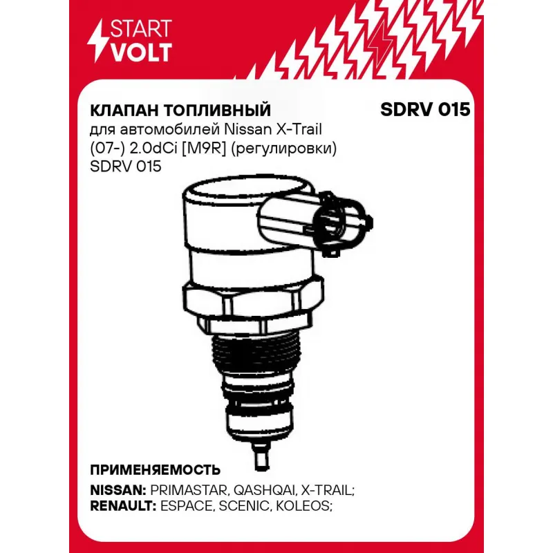 Клапан топливный для автомобилей Nissan X-Trail (07-) 2.0dCi [M9R] (регулировки) Характеристики: Артикул: SDRV 015 OEM номера: 22670-00Q0A, 226706711R, 0281002800 Номинальное напряжение, В: 12 Количество на автомобиль: 1 Комплектация: Паспорт изделия/гарантийный талон Клапан регулировки давления топлива - 1 шт Гарантия: от 1 года.