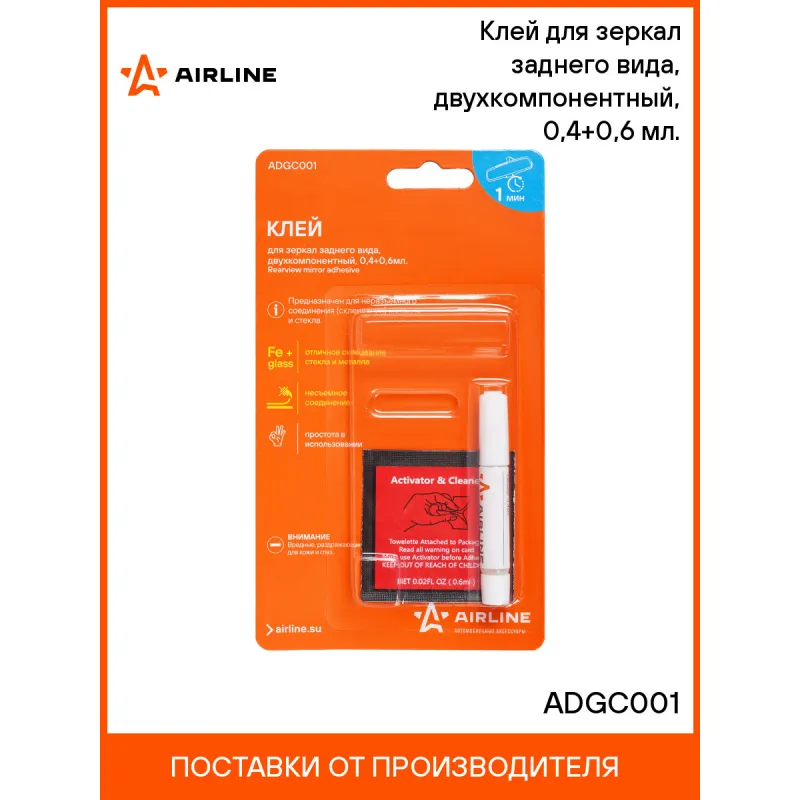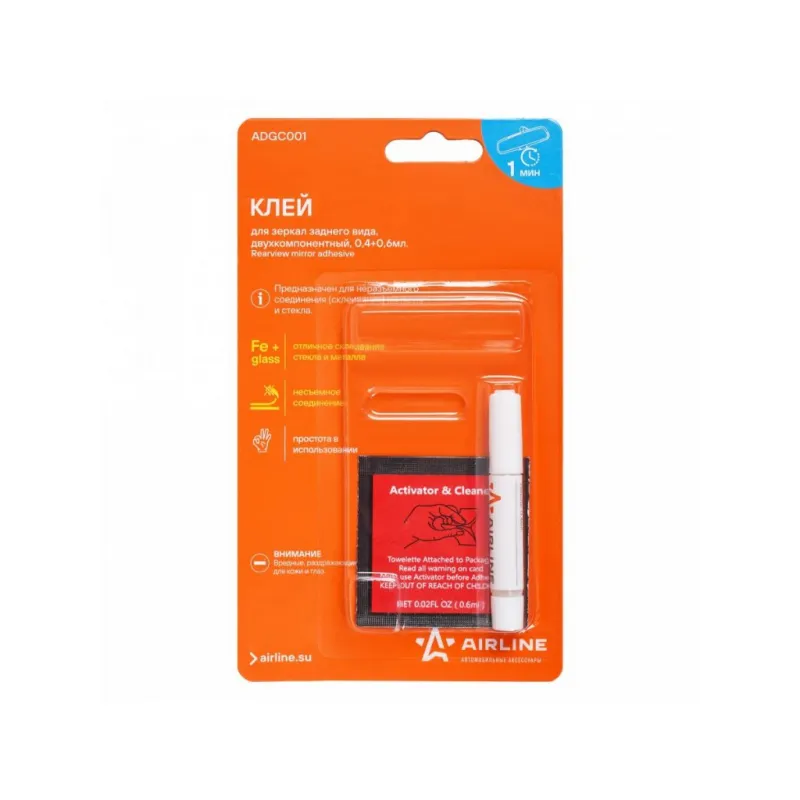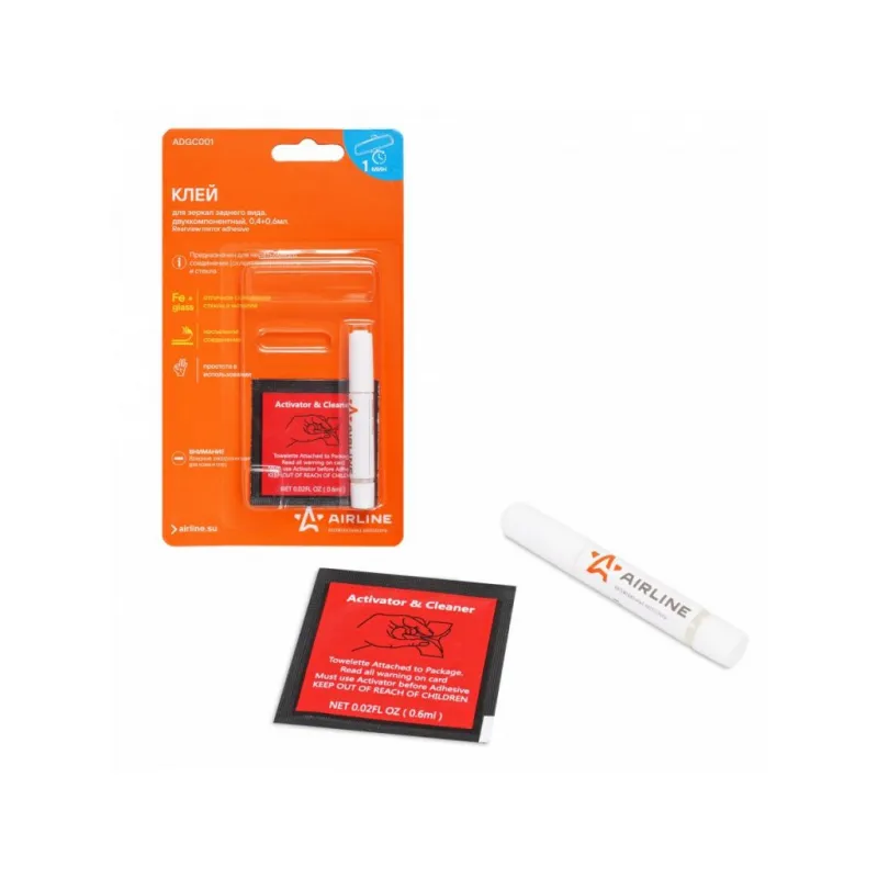 Клей для зеркал заднего вида, двухкомпонентный, 0,4+0,6 мл. Описание: Предназначен для склеивания стекла с металлом. Идеален для установки зеркала заднего вида в автомобиле.Полученное клеевое соединение обладает высокой прочностью и стойкостью к вибрации.Время склеивания 60 секунд. Характеристики: Артикул: ADGC001 Температура эксплуатации, °С: -60/+80 Объем, мл: 0,4+0,6 Материал для склеивания: металлы, стекло Время фиксации, мин: 1 консистенция: жидкая Вид: специальный, двухкомпонентный Цвет после смешивания: прозрачный Время полной полимеризации, ч: 24 Температура монтажа, °С: +10/+40 Индивидуальная добавка: нет Комплектация: Клей - 1 шт Салфетка-активатор - 1 шт Блистер - 1 шт Гарантия: от 1 года.