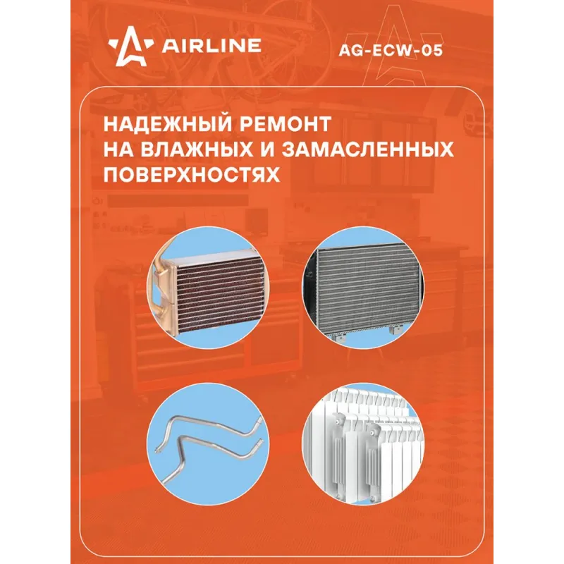 Клей-герметик (холодная сварка) для ремонта радиатора, 55 гр., туба Описание: Предназначен для быстрого и надежного ремонта и герметизации радиаторов легковых, грузовых автомобилей, сельскохозяйственной техники, изготовленных из черных и цветных металлов, работающих при температуре до +150С. Обеспечивает надежный ремонт на влажных и замасленных поверхностях, при низких (до -10°С) температурах (при условии замешивания смеси в теплом помещении). Характеристики: Артикул: AG-ECW-05 Цвет после смешивания: серый Температура эксплуатации, °С: -60/+150 Материал для склеивания: черные и цветные металлы Время фиксации, мин: 10 консистенция: пластилинообразный Вид: эпоксидный, двухкомпонентный Время полной полимеризации, ч: 24 Температура монтажа, °С: +10/+40 Индивидуальная добавка: ускоритель отвердения Комплектация: Клей - 1 шт Туба с вкладышем - 1 шт Гарантия: от 1 года.