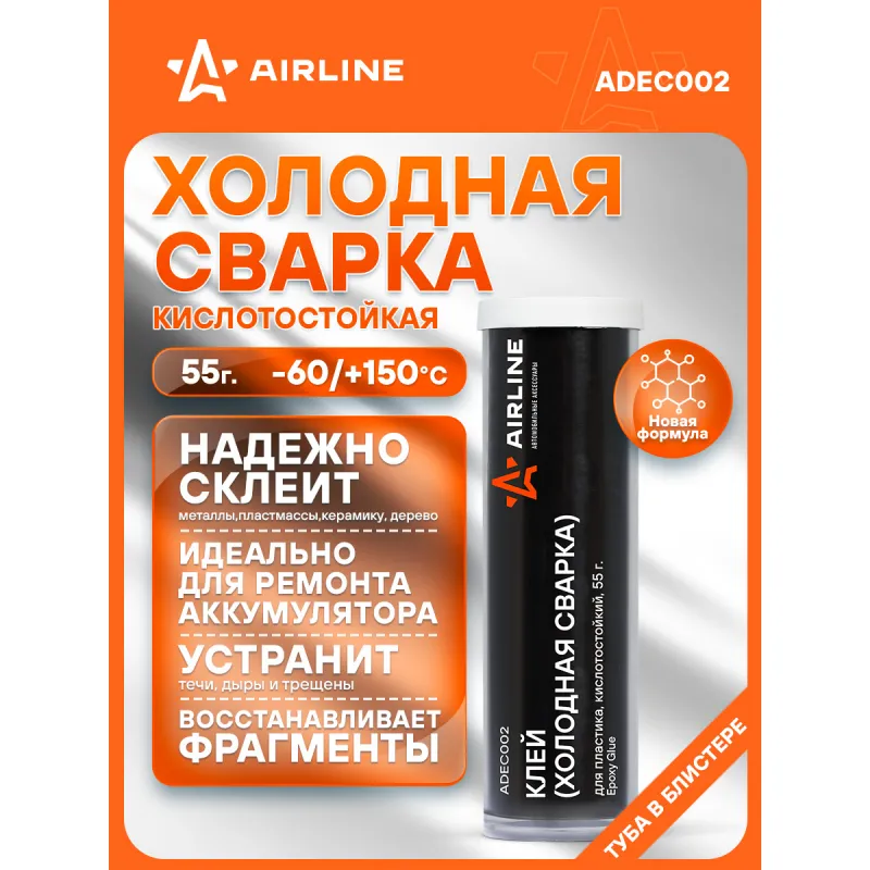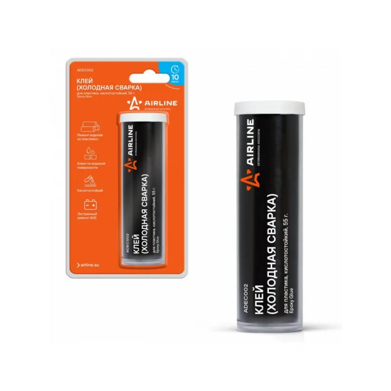 Клей (холодная сварка) для пластика, кислотостойкий, 55 гр., блистер Описание: Предназначен для надежного склеивания, ремонта, герметизации пластиковых бамперов, аккумуляторов, воздуховодов и других деталей из пластмасс (кроме полиэтилена, полипропилена и фторопласта), в том числе склеивания пластиков с различными материалами, работающих при температурах от -60С до +150С Характеристики: Артикул: ADEC002 Температура эксплуатации, °С: -60/+150 Материал для склеивания: пластмассы (кроме полиэтилена, полипропилена и фторопласта) Время фиксации, мин: 15 консистенция: пластилинообразный Вид: эпоксидный, двухкомпонентный Цвет после смешивания: бежевый Время полной полимеризации, ч: 24 Температура монтажа, °С: +10/+40 Индивидуальная добавка: ускоритель отверждения Комплектация: Клей - 1 шт Туба с вкладышем - 1 шт Гарантия: от 1 года.