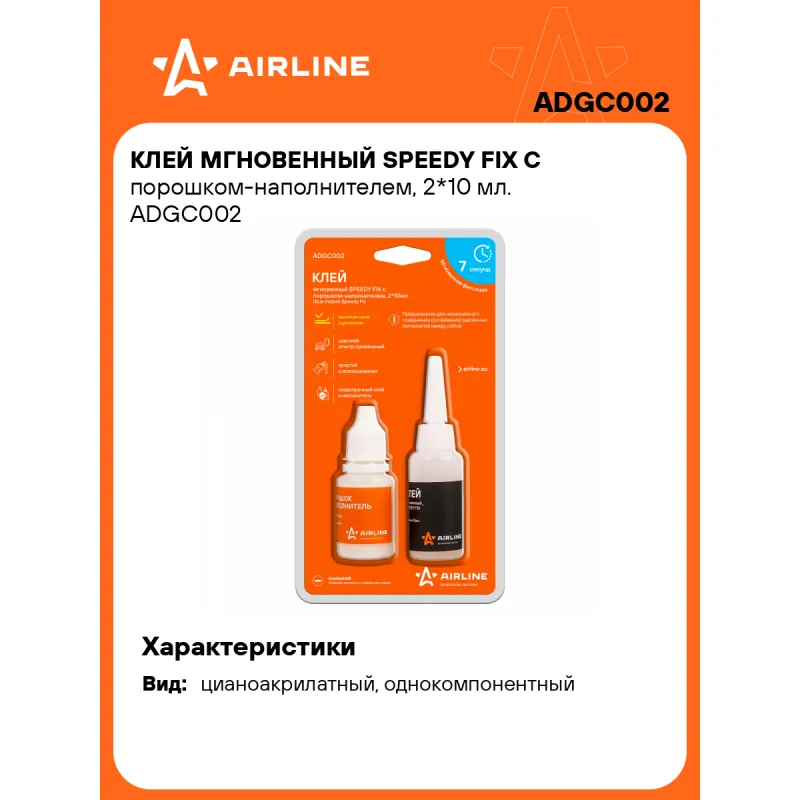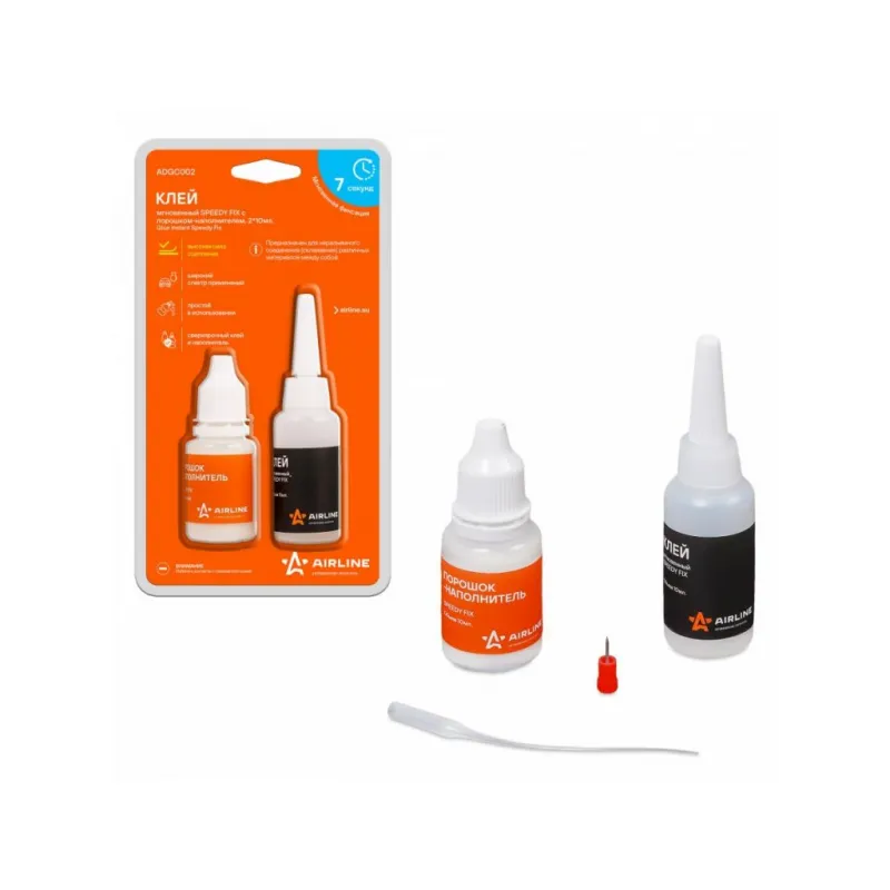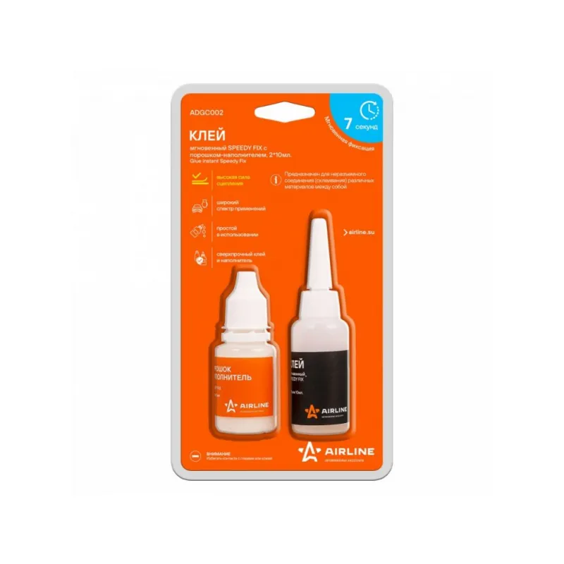 Клей мгновенный SPEEDY FIX с порошком-наполнителем, 2*10 мл. Описание: Предназначен для склеивания различных материалов между собой.Порошок заполняет швы, трещины, сколы и склеивает за 7 секунд практически все, что угодно: авто молдинги, плитку для пола, керамику и стеклянную посуду, дверные ручки, автомобильный кузов, все металлические поверхности и большинство изделий из твердого пластика. Характеристики: Артикул: ADGC002 Температура эксплуатации, °С: -20/+80 Минимальный зазор, мм: 0,1 Материал для склеивания: черные и цветные металлы, пластмассы, стекло, керамика, дерево, кожа Время фиксации, мин: 0,05 консистенция: жидкая/ сыпучая Вид: цианоакрилатный, однокомпонентный Цвет после смешивания: прозрачный Время полной полимеризации, ч: 24 Температура монтажа, °С: +10/+40 Индивидуальная добавка: нет Время схватывания, мин: 0,05 Комплектация: Клей - 1 шт Порошок(гранулы) - 1 шт Носик-удлинитель - 1 шт Игла - 1 шт Блистер - 1 шт Гарантия: от 1 года.