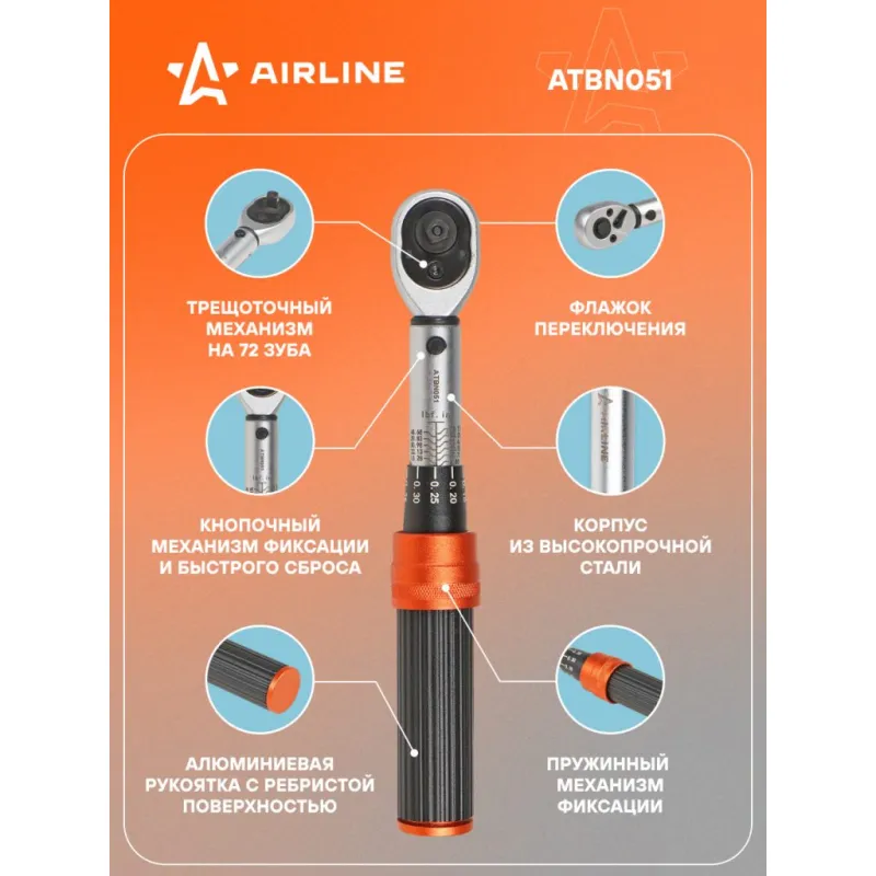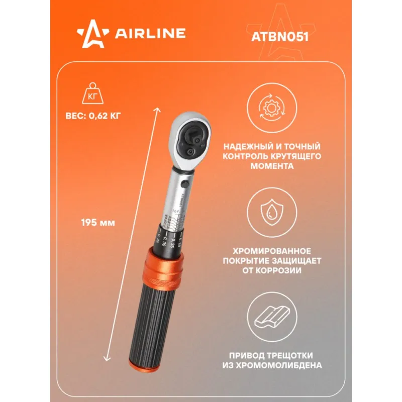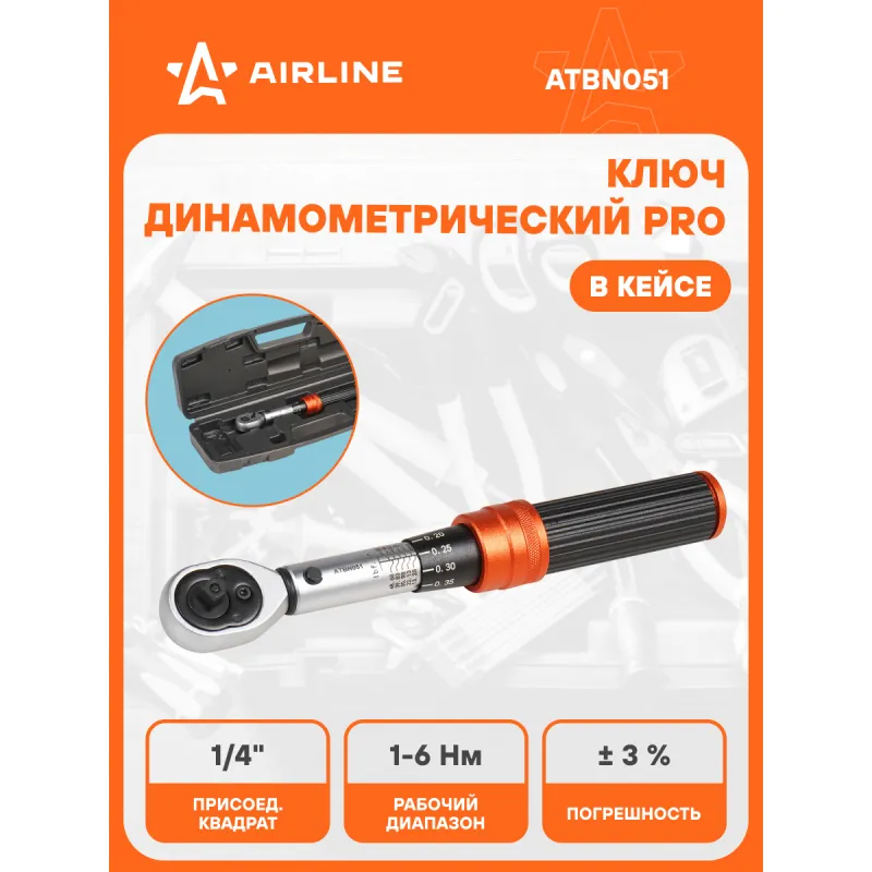 Ключ динамометрический 1/4" 1-6Нм PRO, кнопка быстр.сброса, алюмин.рук., кейс Описание: Динамометрический ключ 1/4" 1-6 Нм PRO длина ключа 195 мм в кейсе с кнопкой быстрого сброса AIRLINE ATBN051 Динамометрический ключ применяется в различных сферах профессиональной деятельности для затяжки резьбовых соединений с точно заданным моментом. Достижение заданного момента сопровождается ощутимым щелчком и небольшим холостым ходом. Ключ изготовлен из высококачественной стали, что придает увеличенный рабочий ресурс и надежность в эксплуатации. Ручка из оксида алюминия, легкая и портативная, имеет ребристую поверхность для надежной фиксации в руке и предотвращения проскальзывания. Прочный храповый механизм выполнен из закаленного сплава хроммолибденовой стали. Финишное анодированное покрытие защищает ключ от воздействия коррозии, делает его более износостойким. * Рабочий диапазон 1-6 Нм. * Длина ключа 195 мм. * Анодированное покрытие защищает от коррозии; * Привод трещотки из хромомолибдена; * Надежный и точный контроль крутящего момента; * Пружинный механизм фиксации; * Корпус из высокопрочной стали; * Кнопочный механизм фиксации и быстрого сброса; * Флажок переключения; * Трещоточный механизм 72 зуба; * Алюминиевая рукоятка с ребристой поверхностью; Универсальный динамометрический ключ из высококачественной стали будет отличным нужным подарком для человека из различных сфер профессиональной деятельности. Характеристики: Артикул: ATBN051 Количество зубьев (трещоточный механизм): 72 Присоединительный квадрат: 1/4" Min значение рабочего диапазона, Нм: 1 Max значение рабочего диапазона, Нм: 6 Погрешность, ±%: 3 Длина, мм: 195 Комплектация: Ключ динамометрический - 1 шт Кейс пластиковый - 1 шт Инструкция - 1 шт Гарантийный талон - 1 шт Гарантия: от 1 года.