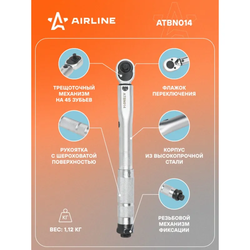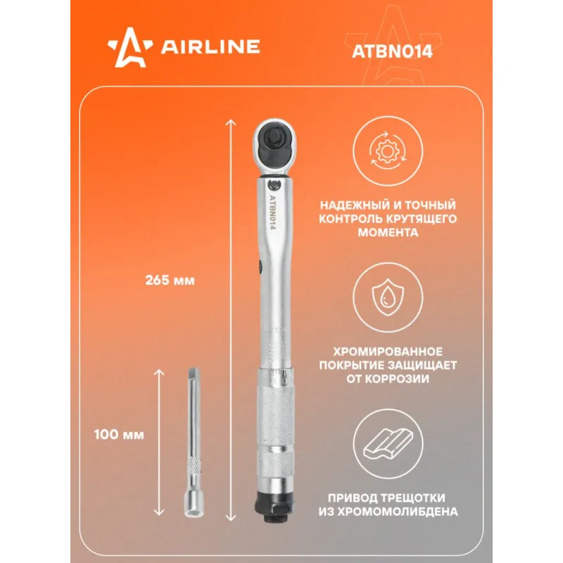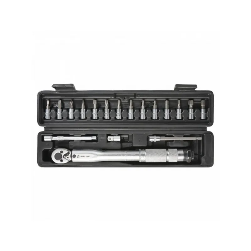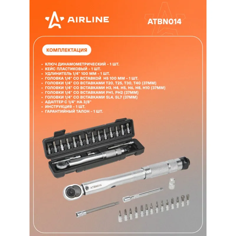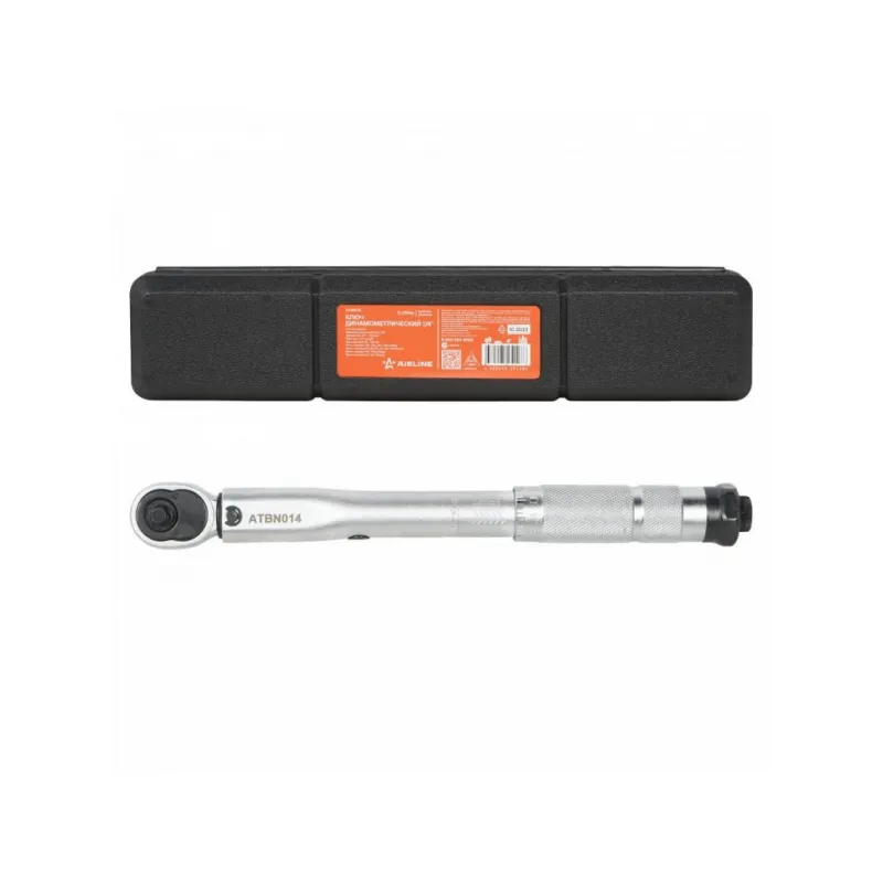 Ключ динамометрический 1/4" 5-25Нм, набор 18пр (удл100мм,биты,дер.для бит,адп3/8"), кейс Описание: Динамометрический ключ 1/4" 5-25 Нм длина ключа 265 мм в кейсе с удлинителем 1/4" 100 мм, адаптером с 1/4" на 3/8" и битами 1/4" H5 100 мм / 1/4" Т20, Т25, Т30, Т40 (37мм) / 1/4" H3, H4, H5, H6, H8, H10 (37мм) / 1/4" PH1, PH2 (37мм) / 1/4" SL4, SL7 (37мм) AIRLINE ATBN014 Динамометрический ключ применяется в различных сферах профессиональной деятельности для затяжки резьбовых соединений с точно заданным моментом. Достижение заданного момента сопровождается ощутимым щелчком и небольшим холостым ходом. Ключ изготовлен из высококачественной стали, что придает увеличенный рабочий ресурс и надежность в эксплуатации. Металлическая рукоятка имеет шероховатую поверхность для надежной фиксации в руке и предотвращения проскальзывания. Прочный храповой мех механизм выполнен из закаленного сплава хромомолибденовой стали. Финишное прочное хромированное покрытие защищает ключ от воздействия коррозии, делает его более износостойким. * Рабочий диапазон 5-25 Нм. * Длина ключа 265 мм. * Хромированное покрытие защищает от коррозии; * Привод трещотки из хромомолибдена; * Надежный и точный контроль крутящего момента; * Резьбовой механизм фиксации; * Корпус из высокопрочной стали; * Флажок переключения; * Трещоточный механизм 45 зубьев; * Рукоятка с шероховатой поверхностью; Универсальный динамометрический ключ из высококачественной стали будет отличным нужным подарком для человека из различных сфер профессиональной деятельности. Характеристики: Артикул: ATBN014 Количество зубьев (трещоточный механизм): 45 Присоединительный квадрат: 1/4" Min значение рабочего диапазона, Нм: 5 Max значение рабочего диапазона, Нм: 25 Погрешность, ±%: 4 Длина, мм: 265 Комплектация: Ключ динамометрический - 1 шт Кейс пластиковый - 1 шт Удлинитель 1/4" 100 мм - 1 шт Адаптер с 1/4" на 3/8" - 1 шт Головка 1/4" со вставкой Т20 (L=37мм) - 1 шт Головка 1/4" со вставкой Т25 (L=37мм) - 1 шт Головка 1/4" со вставкой Т30 (L=37мм) - 1 шт Головка 1/4" со вставкой Т40 (L=37мм) - 1 шт Головка 1/4" со вставкой HEX 3мм (L=37мм) - 1 шт Головка 1/4" со вставкой HEX 4мм (L=37мм) - 1 шт Головка 1/4" со вставкой HEX 5мм (L=37мм) - 1 шт Головка 1/4" со вставкой HEX 6мм (L=37мм) - 1 шт Головка 1/4" со вставкой HEX 8мм (L=37мм) - 1 шт Головка 1/4" со вставкой HEX 10мм (L=37мм) - 1 шт Головка 1/4" со вставкой HEX 5мм (L=100мм) - 1 шт Головка 1/4" со вставкой PH1 (L=37мм) - 1 шт Головка 1/4" со вставкой PH2 (L=37мм) - 1 шт Головка 1/4" со вставкой SL4 (L=37мм) - 1 шт Головка 1/4" со вставкой SL7 (L=37мм) - 1 шт Инструкция - 1 шт Гарантийный талон - 1 шт Гарантия: от 1 года.