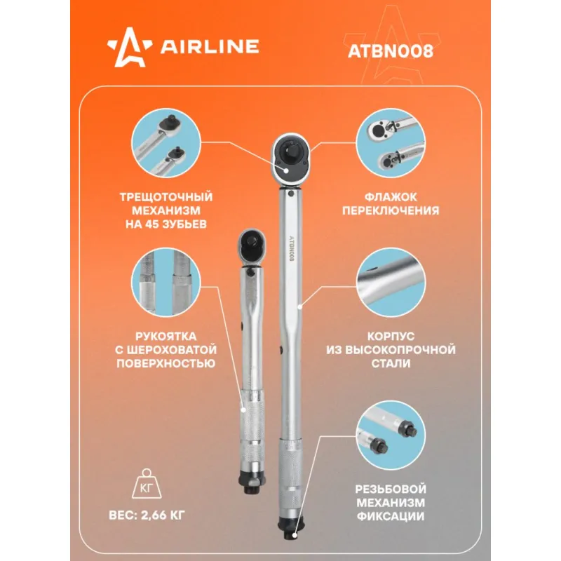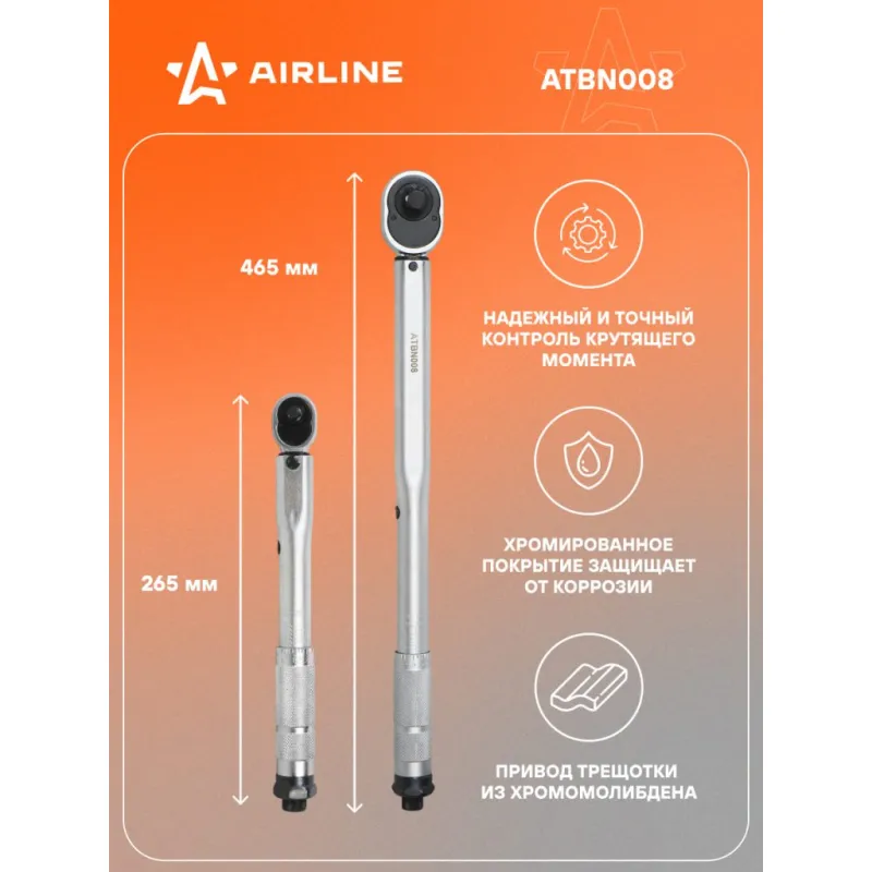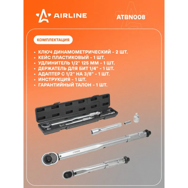 Ключ динамометрический, набор 2 шт. (1/4" 5-25Нм, 1/2" 28-210Нм), кейс Описание: Динамометрические ключи, 2 шт набор 2 шт 1/4" 5-25 Нм и 1/2" 28-210 Нм удлинитель 1/2" 125 мм адаптер с 1/2" на 3/8" держатель для бит 1/4" в кейсе AIRLINE ATBN008 Динамометрический ключ применяется в различных сферах профессиональной деятельности для затяжки резьбовых соединений с точно заданным моментом. Достижение заданного момента сопровождается ощутимым щелчком и небольшим холостым ходом. Ключ изготовлен из высококачественной стали, что придает увеличенный рабочий ресурс и надежность в эксплуатации. Металлическая рукоятка имеет шероховатую поверхность для надежной фиксации в руке и предотвращения проскальзывания. Прочный храповой мех механизм выполнен из закаленного сплава хромомолибденовой стали. Финишное прочное хромированное покрытие защищает ключ от воздействия коррозии, делает его более износостойким. * Рабочий диапазон 1/4" - 5; 1/2" - 28-1/4" - 25; 1/2" - 210 Нм. * Длина ключа 1/4" - 265; 1/2" - 465 мм. * Хромированное покрытие защищает от коррозии; * Привод трещотки из хромомолибдена; * Надежный и точный контроль крутящего момента; * Резьбовой механизм фиксации; * Корпус из высокопрочной стали; * Флажок переключения; * Трещоточный механизм 45 зубьев; * Рукоятка с шероховатой поверхностью; Универсальный динамометрический ключ из высококачественной стали будет отличным нужным подарком для человека из различных сфер профессиональной деятельности. Характеристики: Артикул: ATBN008 Количество зубьев (трещоточный механизм): 45 Присоединительный квадрат: 1/4"; 1/2" Min значение рабочего диапазона, Нм: 1/4" - 5; 1/2" - 28 Max значение рабочего диапазона, Нм: 1/4" - 25; 1/2" - 210 Погрешность, ±%: 4 Длина, мм: 1/4" - 265; 1/2" - 465 Комплектация: Ключ динамометрический - 2 шт Кейс пластиковый - 1 шт Удлинитель 1/2" 125 мм - 1 шт Держатель для бит 1/4" - 1 шт Адаптер c 1/2" на 3/8" - 1 шт Инструкция - 1 шт Гарантийный талон - 1 шт Гарантия: от 1 года.