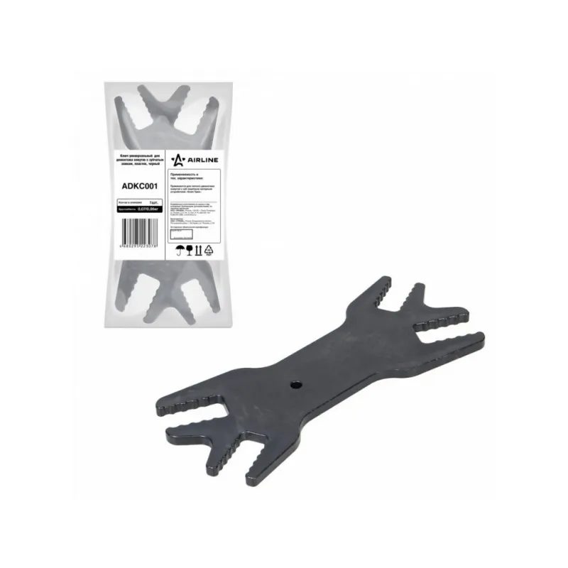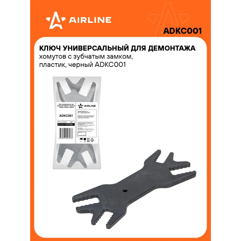 Ключ универсальный для демонтажа хомутов с зубчатым замком, пластик, черный Описание: Ключ плоской формы, имеет зевы (пазы) двух размеров с обоих концов. Применяется для легкого демонтажа хомутов с зуб зацепным запорным устройством «Клип-Трек». Инструкция по применению: Возьмите универсальный пластиковый ключ (большой паз у которого рассчитан для хомутов шириной 9 мм, а паз меньшего размера для хомутов шириной 7 мм, ключ двухсторонний, симметричный) и вставьте его в замок хомута со стороны паза хомута («мама») сориентировав его таким образом, чтоб ребристая стенка рабочей части ключа, попала посередине штока замка хомута. Поворачивая ключ, влево или вправо (в какую сторону удобнее или позволяет место) выдавливаем зубчатый шток из зубчатого паза замка хомута до полного его освобождения, хомут раскрывается и его можно снять, разогнув в стороны края замка хомута и использовать повторно на других изделиях. Внимание! Правильно ориентируйте рабочую часть ключа на шток замка хомута. При не правильной ориентировки вы можете давить не на шток, а на край замка хомута, при этом произойдет поломка рабочей поверхности ключа и замок хомута останется закрытым. Особенности ключа: - Устойчив к УФ; - Ударопрочный; - Температура монтажа - -40/+40 °С; Набор хомутов для стяжек с ключом должны быть в базовом комплекте необходимых автомобильных инструментов. Хомуты - это универсальный и простой в использовании инструмент в быту, для организации кабелей, для сортировки ключей, для фиксации частей мебели, для подвязки растений и фиксации ветвей. Оригинальный товар от производителя Airline. Характеристики: Артикул: ADKC001 Маслобензостойкость: Да Тип замка: зуб зацепной Устойчивость к УФ: Да Ударопрочность: Да Температура монтажа, С: -40/+40 Герметизация, бар: до 24 Комплектация: Ключ - 1 шт Гарантия: от 1 года.