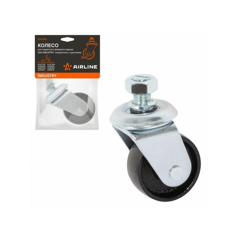 Колесо для подкатного домкрата заднее D60 INDUSTRY, поворотное с крепежом Описание: Универсальное металлическое колесо заднее поворотное для подкатных домкратов INDYSTRY является запасной частью, применяется в случае износа или поломки. Колесо для подкатного домкрата подходит к следующим моделям: AJ-2F-370, AJ25FI430, AJ25FI500, AJ3FI460, AJ-3F-460, AJ3FI500, AJ35FI510, AJ4FI500. Внешний диаметр: 60мм. Ширина колеса: 25мм Характеристики: Артикул: AJFI005 Внешний диаметр, мм: 60 Комплектация: Колесо с поворотным механизмом - 1 шт Гайка М14 - 1 шт Гровер м16 - 1 шт Шайба М14 - 1 шт Пакет с навершием - 1 шт Гарантия: от 1 года.