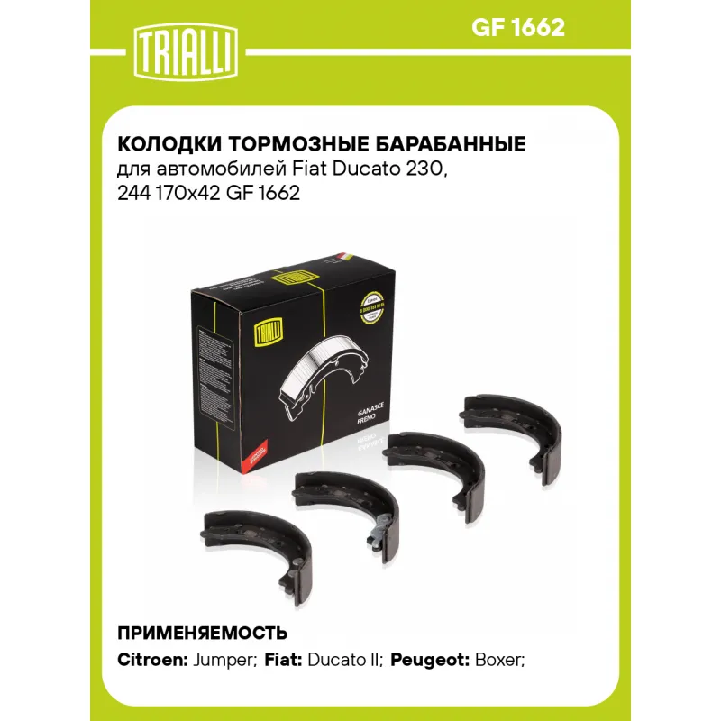Колодки тормозные барабанные для автомобилей Fiat Ducato 230, 244 170х42 Характеристики: Артикул: GF 1662 OEM номера: 4241L1, 4241L9, 4241N0, 77362696, 9949494, 77362396, 77362290, 77363478, 77363479, 77362699 Гарантийный срок: 1 год / 30 000 км Сторона установки: Задняя ось Количество на автомобиль: 1 Ширина, мм: 42 Диаметр, мм: 170 Тормозная система: TRW Товарная линейка: BLACK Подходит для авто: Citroen Jumper (94-), Jumper (94-) Fiat Ducato II (94-), Ducato II (94-) Peugeot Boxer (94-) Для проверки применяемости отправьте VIN автомобиля через вкладку "Есть вопросы о товаре?" Комплектация: Колодка тормозная - 4 шт Гарантия: от 1 года.