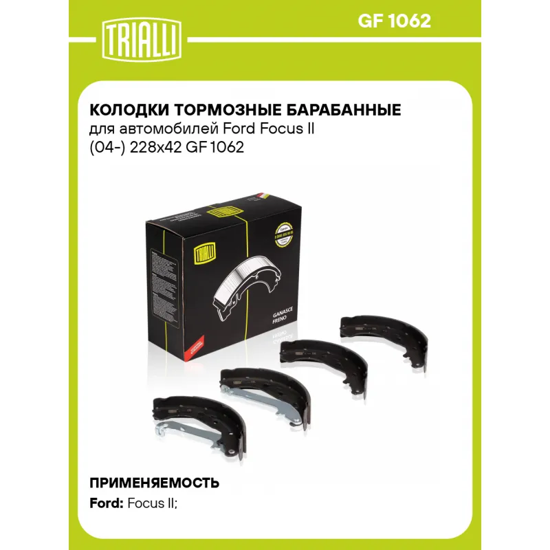 Колодки тормозные барабанные для автомобилей Ford Focus II (04-) 228х42 Характеристики: Артикул: GF 1062 OEM номера: 1347420, 1385735, 3M512200BA, 3M512200BB, 1224569, 1347247, 1689600, 1512077, B3YH2638Z, B3YH2638ZA Гарантийный срок: 1 год / 30 000 км Сторона установки: Задняя ось Количество на автомобиль: 1 Ширина, мм: 42 Диаметр, мм: 228 Тормозная система: Lockheed Сопутствующий товар: Барабаны тормозные: TF 216837 Товарная линейка: BLACK Сопутствующий товар: Шланги тормозные: BF 1071; BF 1073 Подходит для авто: Ford Focus II (05-) Для проверки применяемости отправьте VIN автомобиля через вкладку "Есть вопросы о товаре?" Комплектация: Колодка тормозная - 4 шт Гарантия: от 1 года.