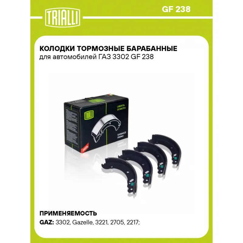 Колодки тормозные барабанные для автомобилей ГАЗ 3302 Характеристики: Артикул: GF 238 OEM номера: 3302-3502090-00, 3302-3502090 Гарантийный срок: 1 год / 30 000 км Сторона установки: Задняя ось Количество на автомобиль: 1 Ширина, мм: 72 Особенности конструкции:: без рычага (комплект: с длинной накладкой - 2 шт., с короткой накладкой - 2 шт.) Диаметр, мм: 279.6 Сопутствующий товар: Барабаны тормозные: TF 062 Товарная линейка: BLACK Трансмиссия: МТ ABS: - Подходит для авто: ГАЗ 3302, 3302, 3302, Gazelle, 3221, 3221, 3221, 2705, 2705, 2705, 2217, 2217, 2217, 3302, 3302, 3302, Gazelle, 3221, 3221, 3221, 3221, 2705, 2705, 2705, 2705, 2217, 2217, 2217, Gazelle-Business, Gazelle-Business, Gazelle-Business, Gazelle-Next (13-), Gazelle-Next (13-) Для проверки применяемости отправьте VIN автомобиля через вкладку "Есть вопросы о товаре?" Комплектация: Колодка тормозная - 4 шт Гарантия: от 1 года.