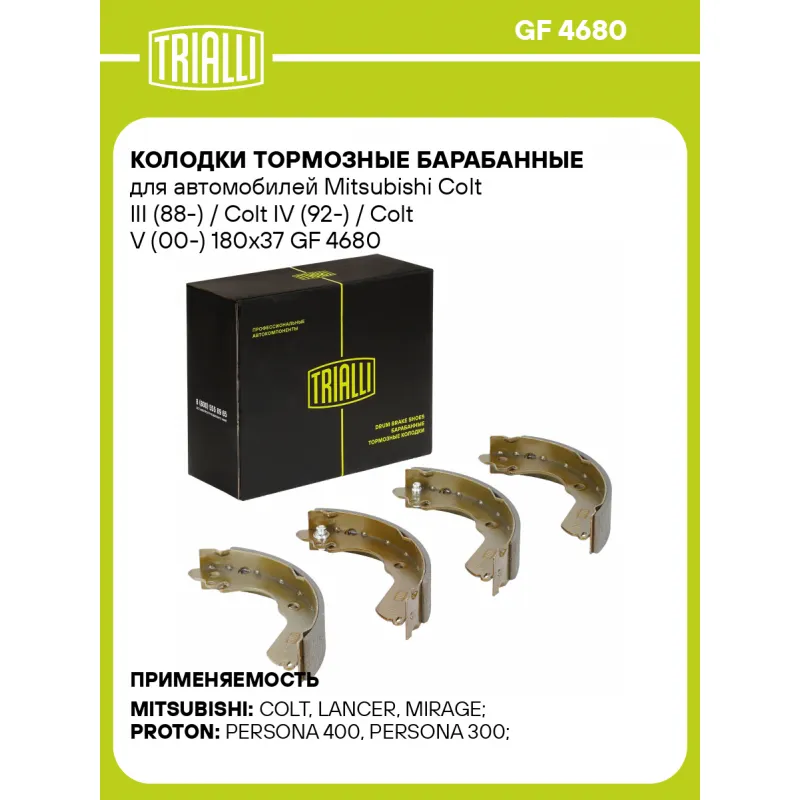 Колодки тормозные барабанные для автомобилей Mitsubishi Colt III (88-) / Colt IV (92-) / Colt V (00-) 180x37 Характеристики: Артикул: GF 4680 OEM номера: MN102632, MB858686, MB858685, MB858684, MB858665, MB668747, PC351603, PC351601, MB668746, MB668745, MB668742, MB668741, MB668740, 4800A095 Ширина, мм: 37 Диаметр, мм: 180 Гарантийный срок: 1 год / 30 000 км Сторона установки: Задняя ось Количество на автомобиль: 1 Товарная линейка: BLACK Комплектация: Колодка тормозная - 4 шт Гарантия: от 1 года.