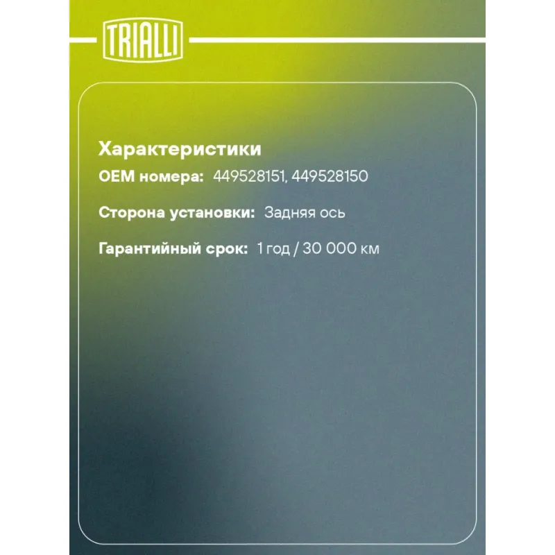 | Гарантийный срок | 1 год / 30 000 км |