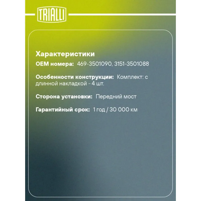 Колодки тормозные барабанные передние для автомобилей УАЗ, новый каркас (4 шт.) Характеристики: Артикул: GF 23301 OEM номера: 469-3501090, 3151-3501088 Гарантийный срок: 1 год / 30 000 км Сторона установки: передний мост Количество на автомобиль: 1 Особенности конструкции:: комплект: с длинной накладкой - 4 шт. Товарная линейка: BLACK ABS: 29 Подходит для авто: УАЗ 469 (72-), 469 (72-), 469 (72-), 31512, 31514, 31519, 3741, 3741, 469 (72-), 3741 Для проверки применяемости отправьте VIN автомобиля через вкладку "Есть вопросы о товаре?" Комплектация: Колодка тормозная - 4 шт Гарантия: от 1 года.