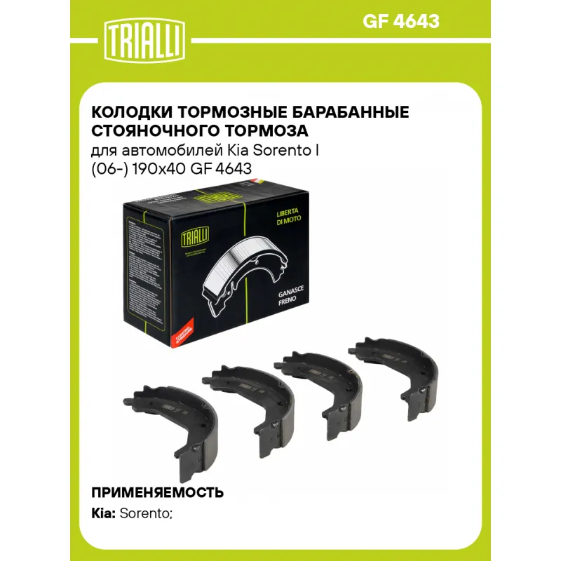 Колодки тормозные барабанные стояночного тормоза для автомобилей Kia Sorento I (06-) 190x40 Характеристики: Артикул: GF 4643 OEM номера: 583503ED01 Гарантийный срок: 1 год / 30 000 км Сторона установки: Задняя ось Количество на автомобиль: 1 Ширина, мм: 40 Диаметр, мм: 190 Товарная линейка: BLACK Подходит для авто: Kia Sorento (06-), Sorento (06-) Для проверки применяемости отправьте VIN автомобиля через вкладку "Есть вопросы о товаре?" Комплектация: Колодка тормозная - 4 шт Гарантия: от 1 года.