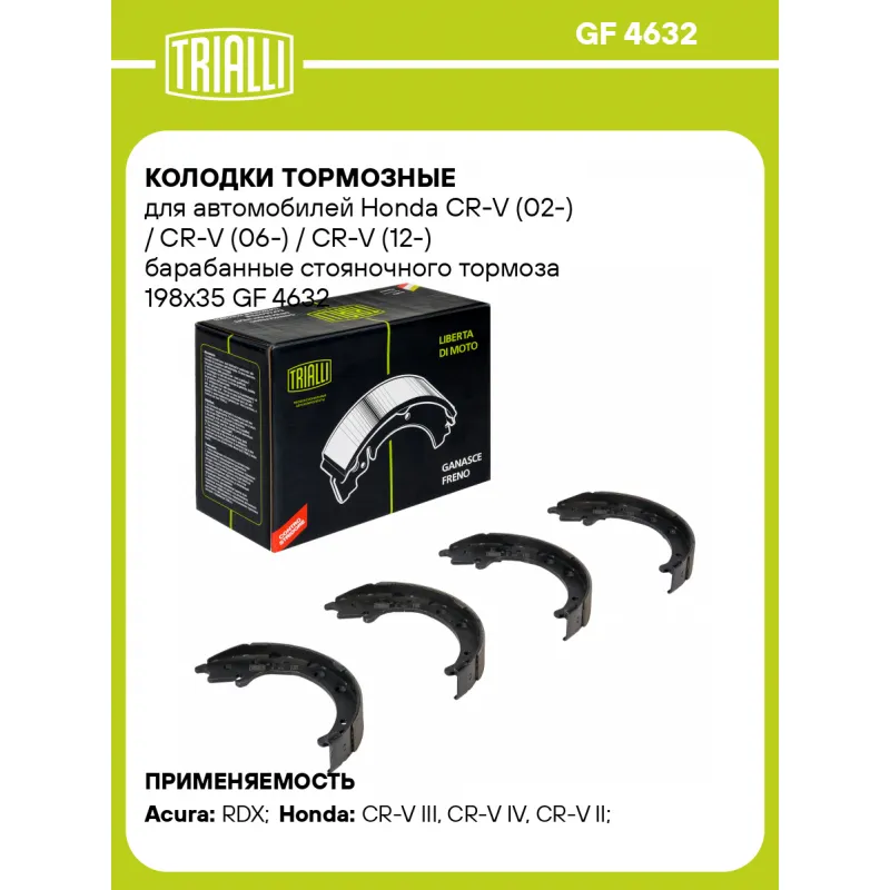 Колодки тормозные для автомобилей Honda CR-V (02-) / CR-V (06-) / CR-V (12-) барабанные стояночного тормоза 198x35 Характеристики: Артикул: GF 4632 OEM номера: 43053S9AE50, 43053S9AE51, 43053S9AE53, 43053-S9A-E52, 43053T1GG00, 43154SFEJ01, 43154SWA003, 43053-SWW-000, 43154STKA01 Гарантийный срок: 1 год / 30 000 км Сторона установки: Задняя ось Количество на автомобиль: 1 Ширина, мм: 35 Диаметр, мм: 198 Товарная линейка: BLACK Подходит для авто: Acura RDX (06-) Honda CR-V III (06-), CR-V IV (12-), CR-V II (02-), CR-V III (06-), CR-V II (02-) Для проверки применяемости отправьте VIN автомобиля через вкладку "Есть вопросы о товаре?" Комплектация: Колодка тормозная - 4 шт Гарантия: от 1 года.