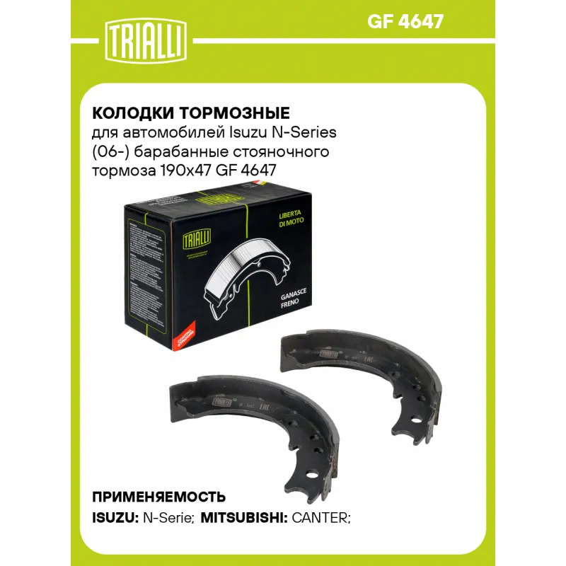 Колодки тормозные для автомобилей Isuzu N-Series (06-) барабанные стояночного тормоза 190x47 Характеристики: Артикул: GF 4647 OEM номера: 8970429331, 8-97180702-0, MC894263 Гарантийный срок: 1 год / 30 000 км Сторона установки: Задняя ось Количество на автомобиль: 2 Ширина, мм: 47 Диаметр, мм: 190 Товарная линейка: BLACK Компл... Читать полностью →