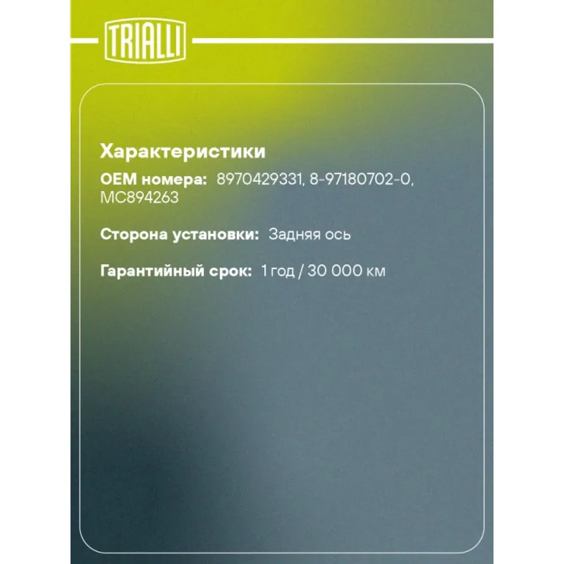 | Гарантийный срок | 1 год / 30 000 км |