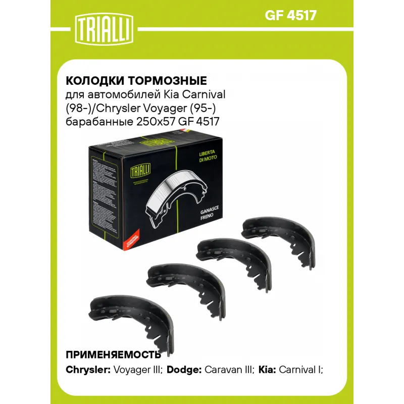 Колодки тормозные для автомобилей Kia Carnival (98-)/Chrysler Voyager (95-) барабанные 250x57 Характеристики: Артикул: GF 4517 OEM номера: 001889S, 04797673, 4883833, 4882059, 0K5522638Z, 0K56A2638Z, 0K56A2638ZA, 4883833AA, 04883833AA, 0K58A2638Z Гарантийный срок: 1 год / 30 000 км Сторона установки: Задняя ось Количество на автомобиль: 1 Сопутствующие товары:: CF 2006 Ширина, мм: 57 Диаметр, мм: 250 Товарная линейка: BLACK Подходит для авто: Chrysler Voyager III (95-) Dodge Caravan III (95-), Caravan III (95-) Kia Carnival I (98-), Carnival I (98-) Для проверки применяемости отправьте VIN автомобиля через вкладку "Есть вопросы о товаре?" Комплектация: Колодка тормозная - 4 шт Гарантия: от 1 года.