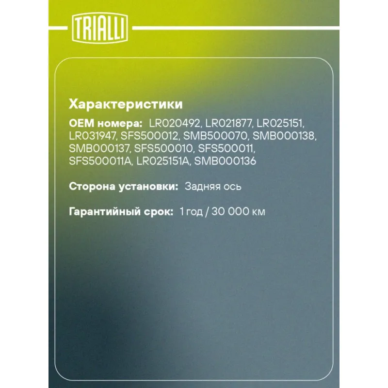| Гарантийный срок | 1 год / 30 000 км |