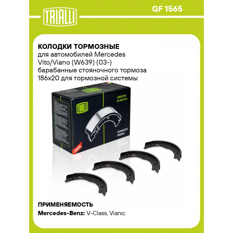 Колодки тормозные для автомобилей Mercedes Vito/Viano (W639) (03-) барабанные стояночного тормоза 186x20 для тормозной системы Bosch Характеристики: Артикул: GF 1565 OEM номера: 639 420 02 20, A 639 420 02 20, 6394200020 Гарантийный срок: 1 год / 30 000 км Сторона установки: Задняя ось Количество на автомобиль: 1 Ширина, мм: 20 Особенности конструкции:: Стояночная тормозная система Диаметр, мм: 186 Тормозная система: Bosch Товарная линейка: BLACK Подходит для авто: Mercedes-Benz V-Class (W447) (14-), Viano (W639) (03-) Для проверки применяемости отправьте VIN автомобиля через вкладку "Есть вопросы о товаре?" Комплектация: Колодка тормозная - 4 шт Гарантия: от 1 года.