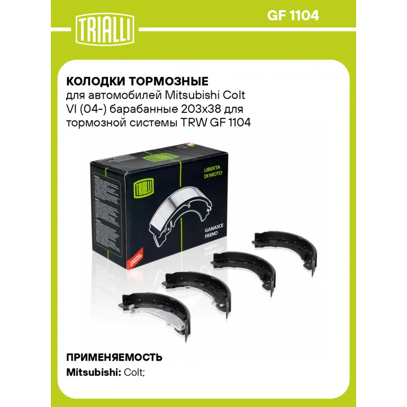 Колодки тормозные для автомобилей Mitsubishi Colt VI (04-) барабанные 203x38 для тормозной системы TRW Характеристики: Артикул: GF 1104 OEM номера: MN186120, 4544200202, A4544200202, 128410522, MA1026340M1, MA1026330M1, MA1026310M1 Гарантийный срок: 1 год / 30 000 км Сторона установки: Задняя ось Количество на автомобиль: 1 Сопутствующие товары:: CF 0148 Ширина, мм: 38 Диаметр, мм: 203 Тормозная система: TRW Товарная линейка: BLACK Подходит для авто: Mitsubishi Colt (04-) Для проверки применяемости отправьте VIN автомобиля через вкладку "Есть вопросы о товаре?" Комплектация: Колодка тормозная - 4 шт Гарантия: от 1 года.