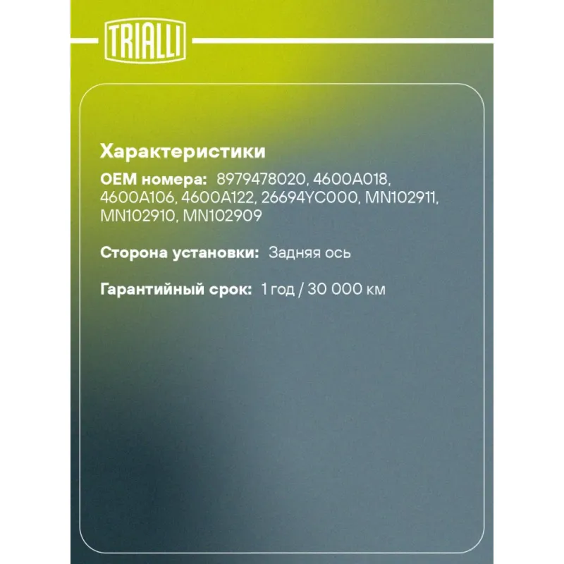 | Гарантийный срок | 1 год / 30 000 км |