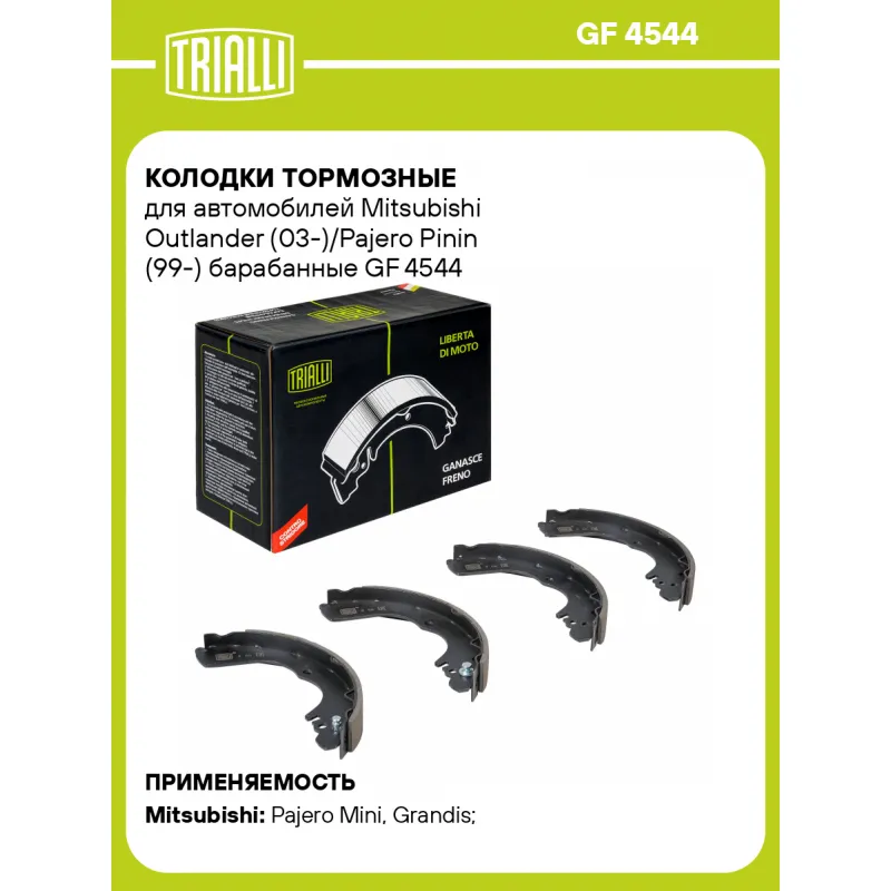 Колодки тормозные для автомобилей Mitsubishi Outlander (03-)/Pajero Pinin (99-) барабанные Характеристики: Артикул: GF 4544 OEM номера: MR249576, MR249577, MR289625, MR376699, MR449682, MR449683, MR449684, MR476000 Гарантийный срок: 1 год / 30 000 км Сторона установки: Задняя ось Количество на автомобиль: 1 Ширина, мм: 32 Диаметр, мм: 229 Тормозная система: Akebono Товарная линейка: BLACK Подходит для авто: Mitsubishi Pajero Mini (94-), Grandis (03-), Outlander I (03-) Для проверки применяемости отправьте VIN автомобиля через вкладку "Есть вопросы о товаре?" Комплектация: Колодка тормозная - 4 шт Гарантия: от 1 года.