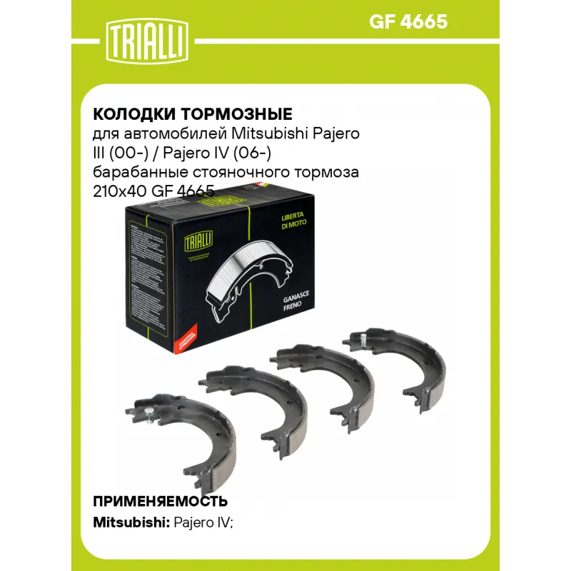Колодки тормозные для автомобилей Mitsubishi Pajero III (00-) / Pajero IV (06-) барабанные стояночного тормоза 210x40 Характеристики: Артикул: GF 4665 OEM номера: 4800A058 Гарантийный срок: 1 год / 30 000 км Сторона установки: Задняя ось Количество на автомобиль: 1 Ширина, мм: 40 Диаметр, мм: 210 Товарная линейка: BLACK Подходит для авто: Mitsubishi Pajero IV (06-), Pajero IV (06-) Для проверки применяемости отправьте VIN автомобиля через вкладку "Есть вопросы о товаре?" Комплектация: Колодка тормозная - 4 шт Гарантия: от 1 года.